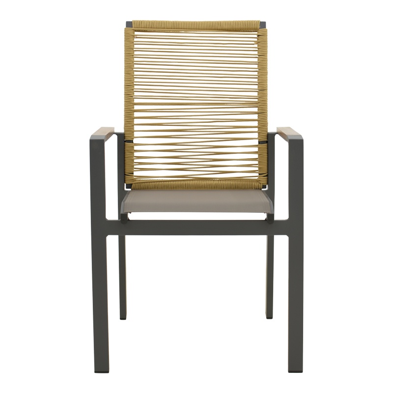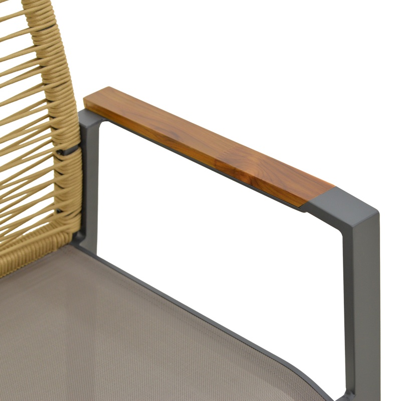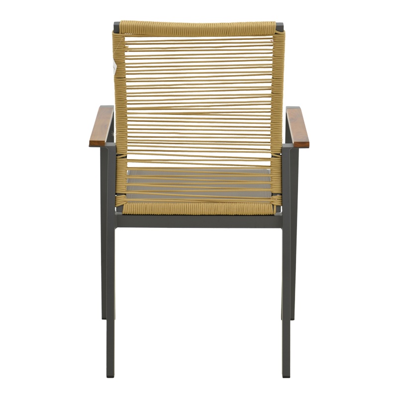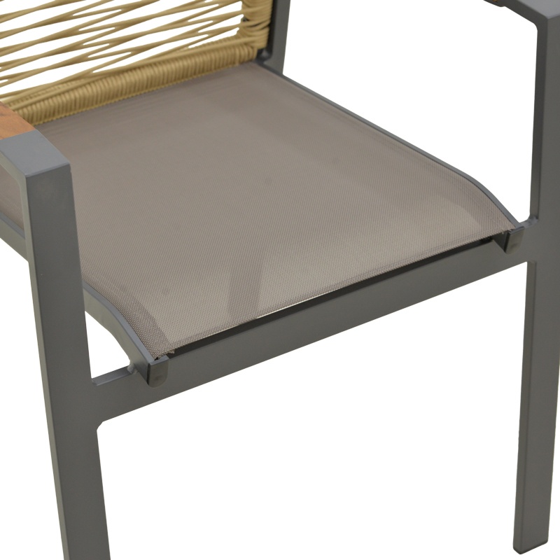 Scaun grădină Aegean, Antracit — Confort stivabil pentru terasă și grădină, 57x64x87 cm Design și materiale de calitate O prezență elegantă și aerisită pentru colțul tău de relaxare: cadrul subțire din Metal vopsit în nuanță antracit oferă o siluetă sofisticată, brațele din teak aduc accente naturale, iar împletitura din sfoară Ø5mm în nuanță naturală creează textura vizuală perfectă. Suprafața textilă tip Textline combină confortul cu rezistența la utilizare exterioară, însoțită de un strat pulverizat de protecție care prelungește viața finisajului. Pentru referință materială în colecția noastră menționăm și Lemn PAL și Lemn MDF ca termeni folosiți frecvent în descrierile tehnice. Funcționalitate și organizare Aegean rezolvă nevoia de flexibilitate în exterior: designul stivabil economisește spațiu, greutatea redusă de doar 3.7 kg face manipularea facilă, iar capacitatea de susținere de până la 120 kg asigură fiabilitate pentru utilizarea zilnică. Dimensiunile compacte — 57 x 64 x 87 cm (L x l x H) — îl recomandă pentru terase, grădini și zone lounge unde stilul întâlnește utilitatea. Montaj și întreținere Scaunul este livrat gata pentru utilizare, nu necesită asamblare , iar întreținerea este simplă: curăță suprafețele cu o lavetă moale și evită substanțele abrazive. Finisajul cu strat pulverizat oferă protecție suplimentară împotriva uzurii și păstrează nuanța antracit mai mult timp. Menționăm, de asemenea, Lemn PAL și Lemn MDF în lista noastră de referință materială. Comandă acum și transformă-ți spațiul! Adaugă scaunul Aegean în terasa ta — un mix rafinat de confort, durabilitate și stil care îți va reinventa momentele de relaxare în aer liber. Detalii tehnice complete Dimensiuni și greutate Dimensiuni produs: 57 x 64 x 87 cm Greutate produs: 3.7 kg Capacitate maximă de susținere: 120 kg Materiale și caracteristici Material corp: Metal (aluminiu), sfoară textilă, brațe din teak; Lemn PAL; Lemn MDF Material finisaj/tapițerie: Textline (textilă exterior), strat pulverizat de protecție Culoare: Antracit (cu accente naturale) Număr pachete: 1 Montaj și pachet Stare asamblare: Livrat asamblat (nu necesită asamblare) Conținut pachet: 1 x Scaun Aegean, ambalaj de fabrică Stil și origine Stil: Modern Destinație recomandată: Grădină / Terasă / Lounge