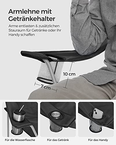 Setul de 2 scaune camping pliabile Songmics, în nuanță neagră, este perfect pentru aventuri în aer liber. Fiecare scaun cântărește doar 2,3 kg și se pliază ușor, putând fi transportat în geanta de 14 x 86 x 14 cm. Cu un cadru din oțel robust, ce suportă până la 120 kg, și o țesătură Oxford 600D rezistentă la uzură, aceste scaune oferă confort optim. Dimensiunile scaunului sunt de 42 x 40 cm, iar spătarul are o înălțime de 48 cm. Folosirea este simplă, fără asamblare necesară, iar buzunarele de pe cotiere sunt ideale pentru băuturi și telefoane. Perfecte pentru camping, plajă, pescuit sau evenimente sportive.