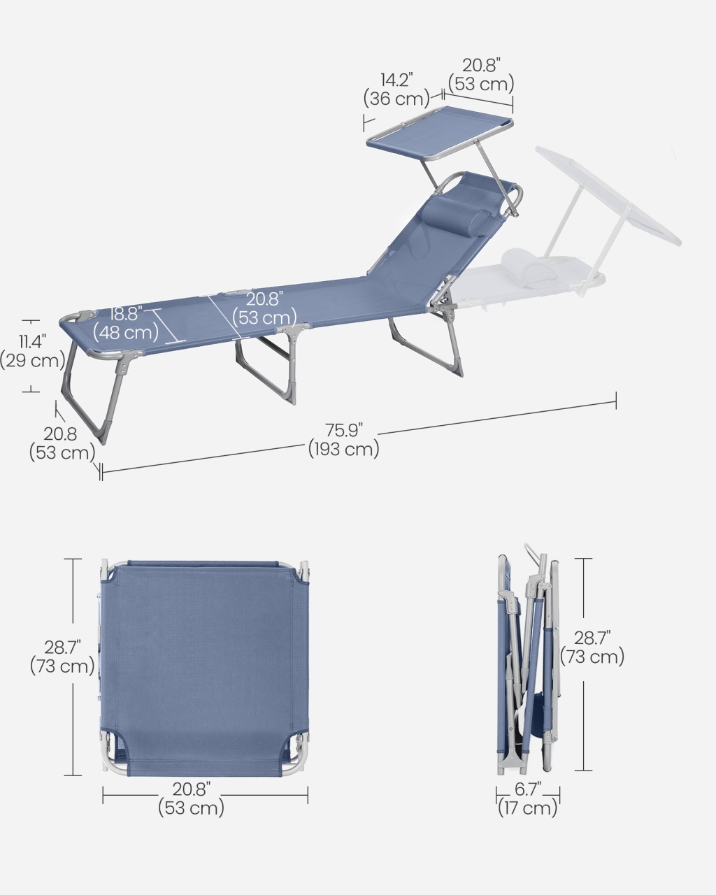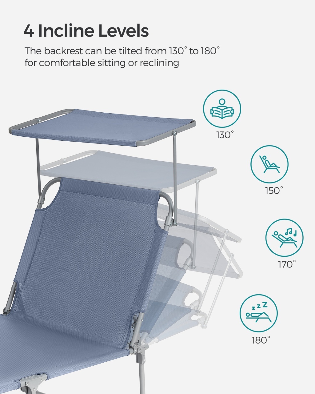 Sezlongul Songmics albastru (193x53x29 cm) este alegerea perfectă pentru relaxare în aer liber, combinând un design modern cu materiale de calitate. Cu un cadru din oțel vopsit și material textil sintetic respirabil, oferă confort și prospețime chiar și în zilele călduroase. Spătarul reglabil în 4 poziții și tetiera detașabilă permit personalizarea relaxării, iar copertina ajustabilă protejează ochii. Pliabil și ușor de transportat, sezlongul se strânge compact și susține o capacitate maximă de 150 kg. Ușor de întreținut, se curăță cu o cârpă umedă, fiind ideal pentru terasă, balcon sau grădină.