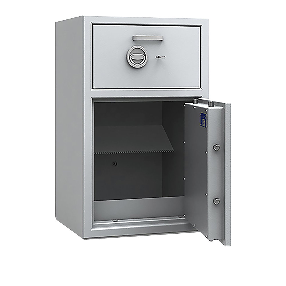 Seiful cu fantă pentru introducerea valorilor dispune de o ușă frontală robustă și este certificat conform standardului ECB-S D-I. Dimensiunile sale externe sunt de 1280 mm înălțime, 730 mm lățime și 510 mm adâncime, oferind un spațiu generos pentru stocarea în siguranță a bunurilor de valoare. Construcția sa solidă asigură protecție împotriva accesului neautorizat, fiind ideal pentru păstrarea banilor, actelor importante și bijuteriilor. Designul său practic facilitează introducerea rapidă a valorilor prin fantă, combinând securitatea cu eficiența.