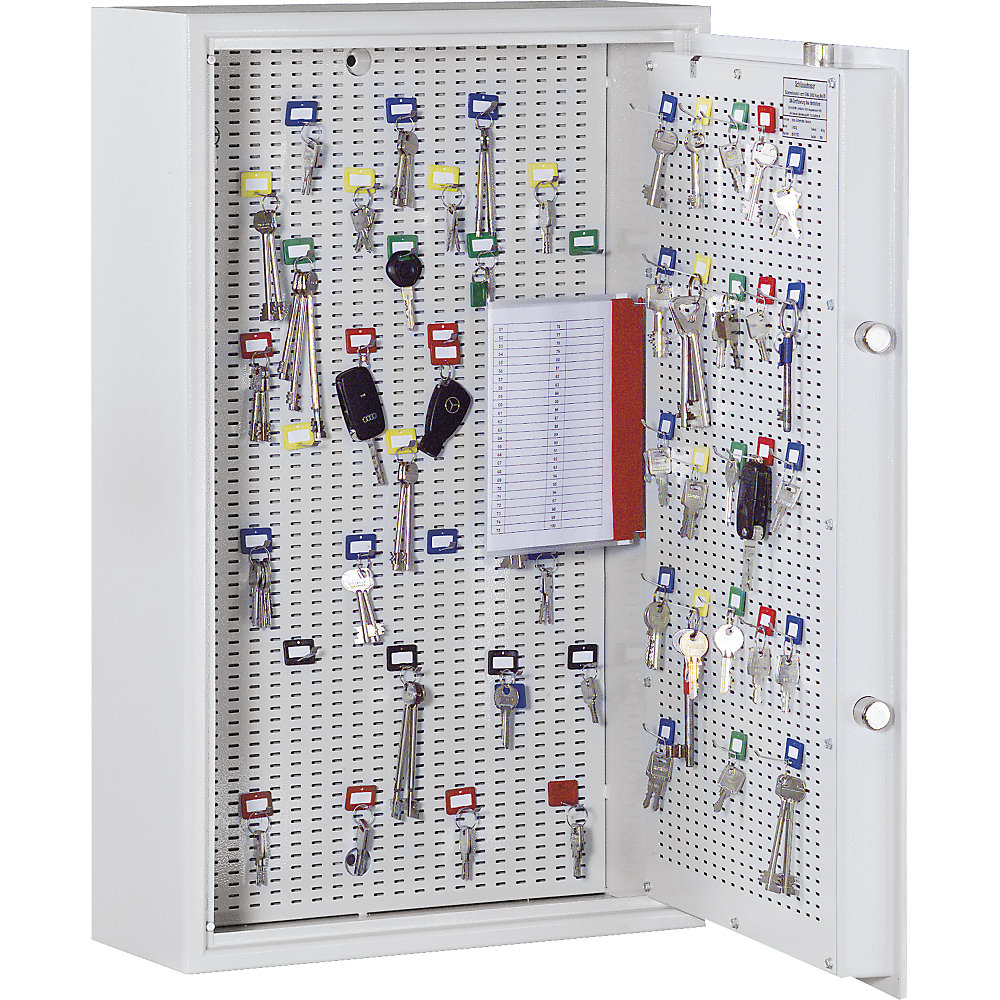 Seiful pentru chei de culoare gri deschis, cu grad de securitate A și conform normei UE S1, este ideal pentru protejarea cheilor sau altor obiecte de valoare. Dimensiunile sale generoase de 1800 x 1000 x 200 mm îți permit să depozitezi până la 1000 de cârlige. Protejează-ți cheile într-un mod sigur și eficient cu acest seif de înaltă calitate.