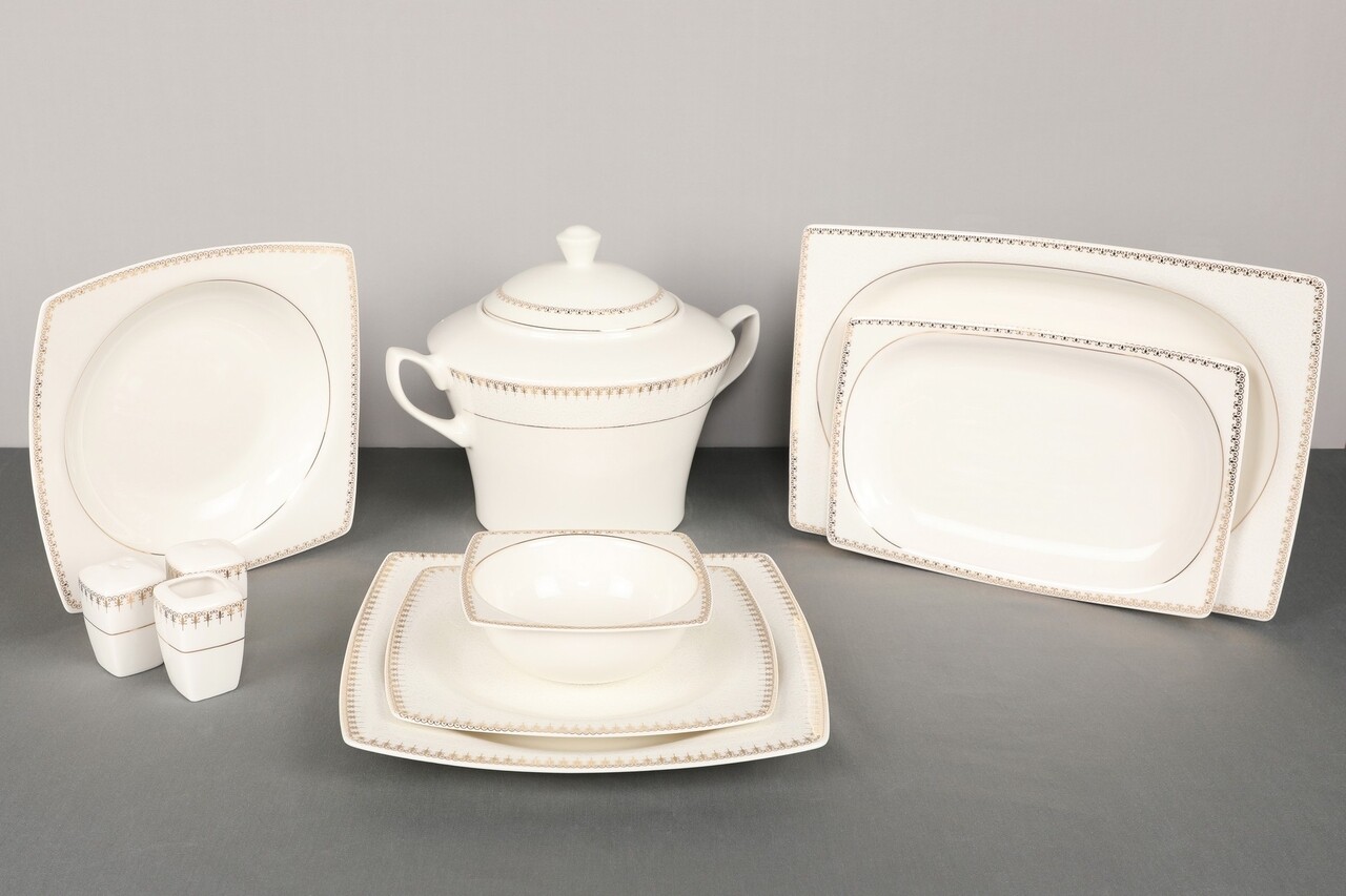 Setul include:Bol mare pentru supa cu capac: 25 x 25 x 10 cm;12 farfurii: 27 x 27 x 2 cm;12 farfurii: 23 x 23 x 2 cm;12 farfurii pentru desert: 21 x 21 x 2 cm;12 boluri: 15 x 15 x 5 cm;4 platouri: 24 x 24 x 2 cm;2 platouri mari: 28 x 28 x 2 cm;2 solnite pentru sare si 2 solnite pentru piper;2 suporturi pentru scobitori.Produsele sunt compatibile cu masina de spalat vase si cuptor cu microunde.