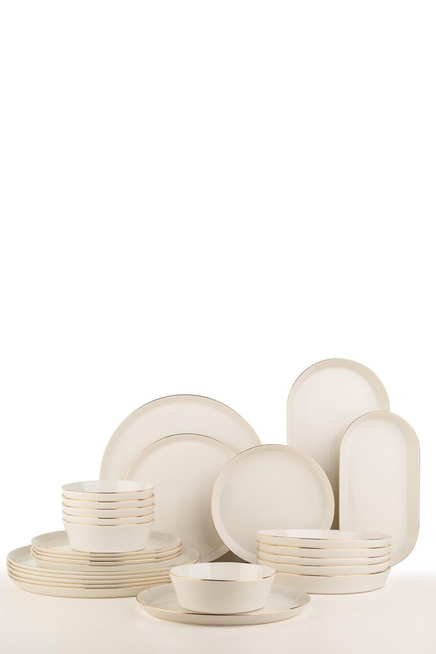 Serviciu de masa (26 de piese)Farfurie intinsa: 27 cm (6 piese)Farfurie: 21 cm (6 piese)Farfurie adanca: 19 cm (6 piese)Bol: 13 cm (6 piese)Platou servire: 24 cm (1 piesa)Platou mare: 32 cm (1 piesa)