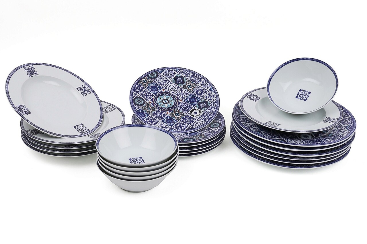 Serviciu de masa PortelanFarfurie intinsa: 25 cm (6 piese)Farfurie: 23 cm (6 piese)Bol: 16 cm / 500 cc (6 piese)Farfurie pentru desert: 21 cm (6 piese)Se poate folosi in cuptorul cu microunde