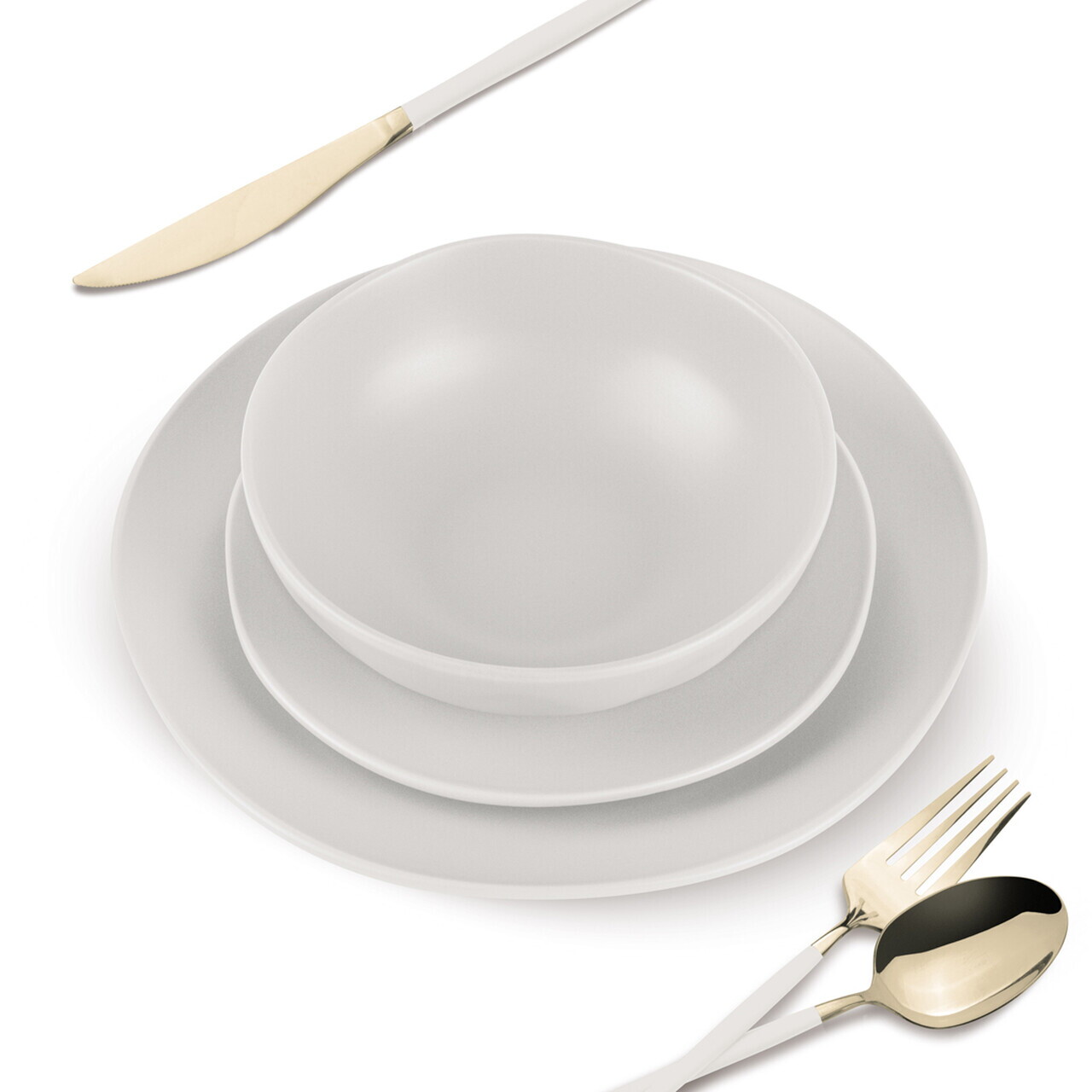 Gresie de calitate premiumDesign matPotrivit pentru masina de spalat vasePotrivit pentru cuptorul cu microundeMaterial: gresieInclude:6 farfurii de cina: 27x3 cm6 boluri de salata: 18x6 cm6 farfurii de desert: 20x2 cmCuloare: crem mat
