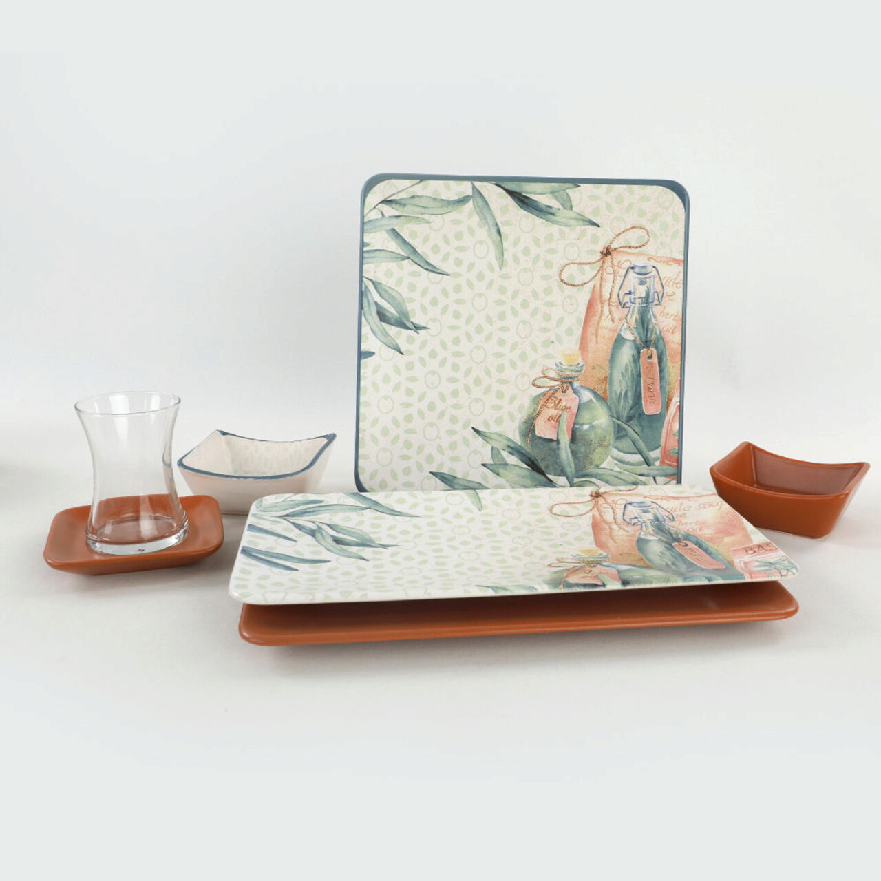 Set de mic dejun CeramicaNu absoarbe apaAntibacterianEco-FriendlyUsor de curatatFarfurie intinsa: 25 cm (6 piese)Bol: 10 cm (12 piese)Platou servire: 17 x 31 cm (2 piese)Platou servire: 21 x 31 cm (1 piesa)Pahar de ceai: 9 cm / 170 ml (6 piese)Farfurie din sticla pentru ceai: 11 cm (6 piese)Se poate folosi in cuptorul cu microunde.Se poate curata in masina de spalat vase pana la 50 °C.