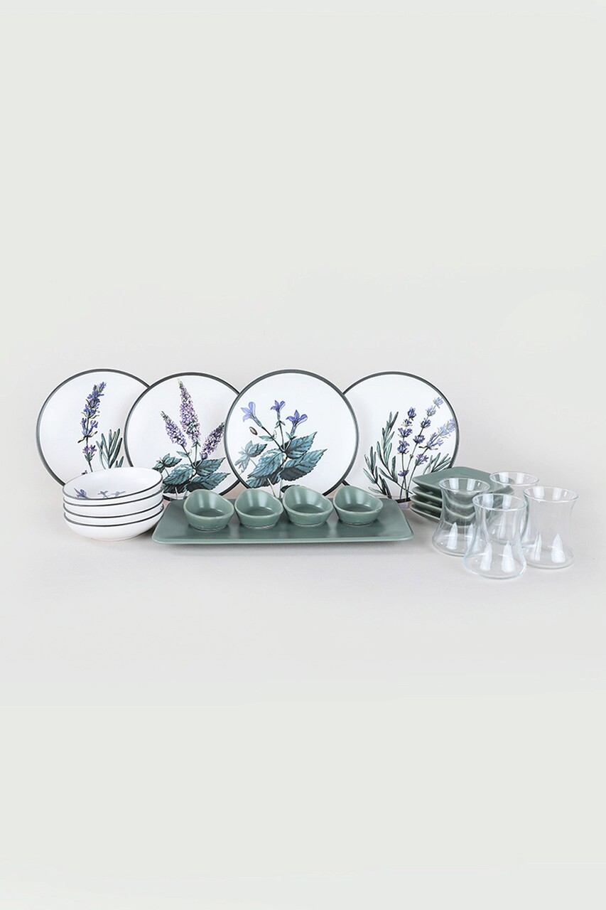 Setul de mic dejun Keramika 275KRM1736 este compus din 4 farfurii pentru desert, un platou de servire, 4 boluri, 4 suporturi pentru ouă, 4 cești de ceai și 4 farfurioare pentru cești. Fabricat din ceramică multicolor, acest set nu absoarbe apa, fiind antibacterian și prietenos cu mediul. Este ușor de curățat, rezistent la șocuri termice și abraziune. Poate fi utilizat atât în cuptorul cu microunde, cât și în congelator, iar curățarea se poate face în mașina de spălat vase până la 60 °C. Perfect pentru un mic dejun plin de culoare și stil!