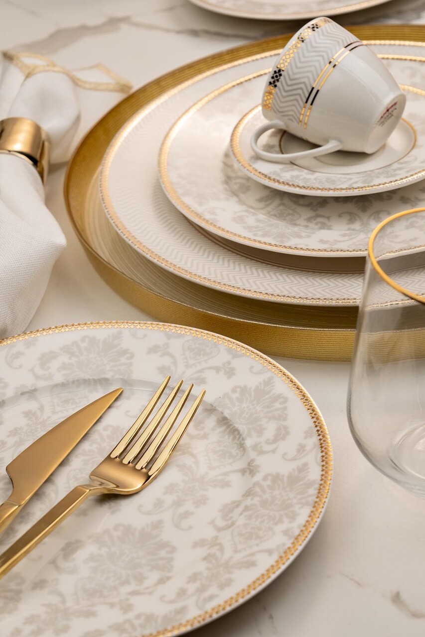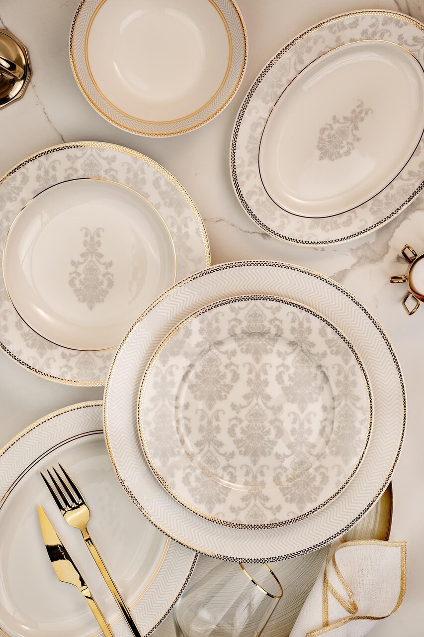 Serviciu de masa (68 de piese)Farfurie intinsa: 27 cm (12 piese)Farfurie adanca: 23 cm (12 piese)Farfurie pentru desert: 21 cm (12 piese)Bol: 15 cm (12 piese)Platou servire: 24 cm (4 piese)Platou mare: 28 cm (2 piese)Ceasca de cafea (6 piese)Farfurioara (6 piese)Bol pentru serviciu de supă (1 piesa)Capac pentru bol de serviciu supă (1 piesa)