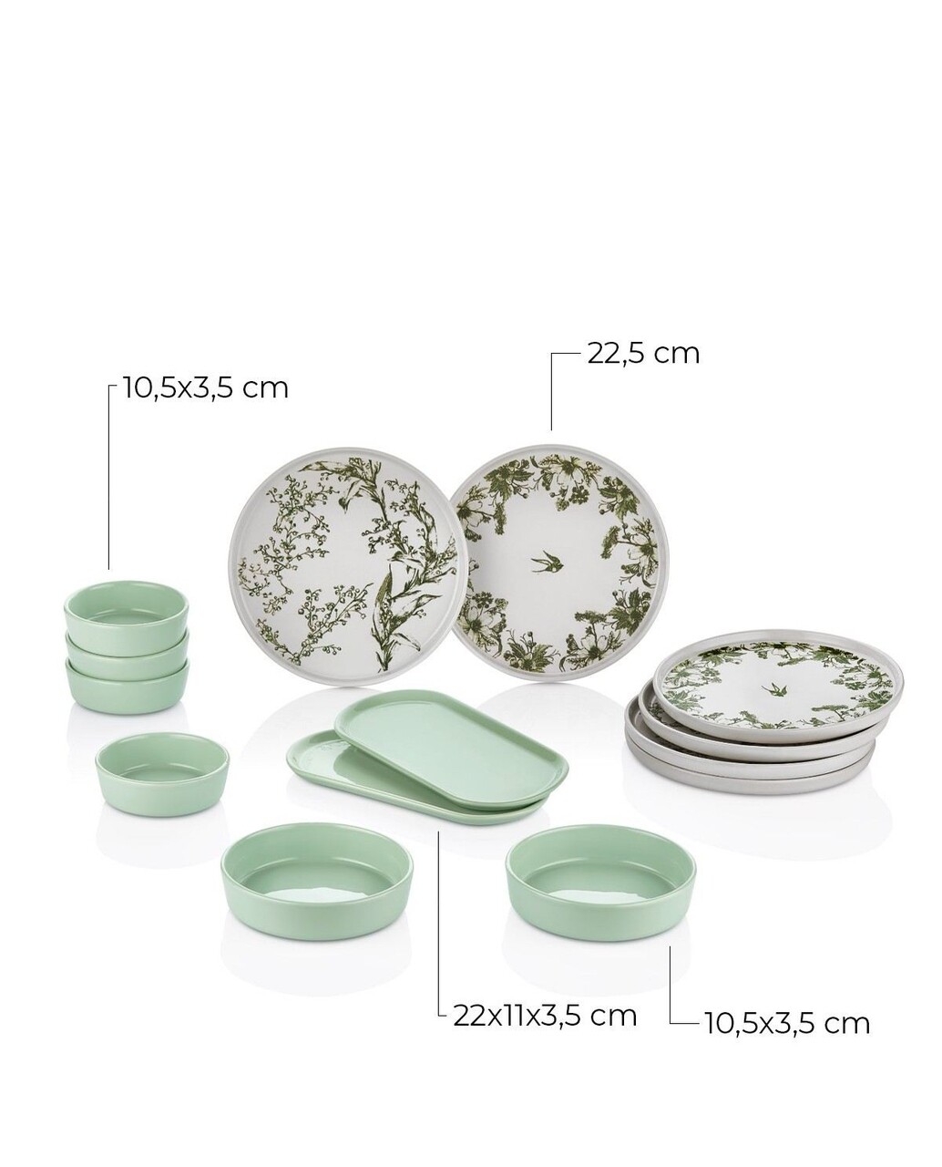 Set de mic dejun (14 piese)Farfurie: 20 cm (6 piese)Farfurii: 22 x 11 x 3,5 cm (2 piese)Bol cu gem: 10,5 x 10,5 x 3,5 cm (4 piese)Bol cu brânză: 13 x 13 x 3,5 cm (2 piese)