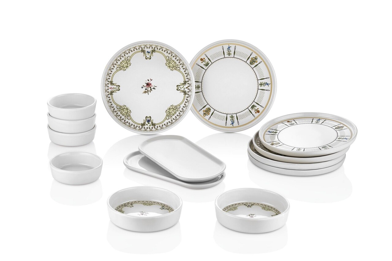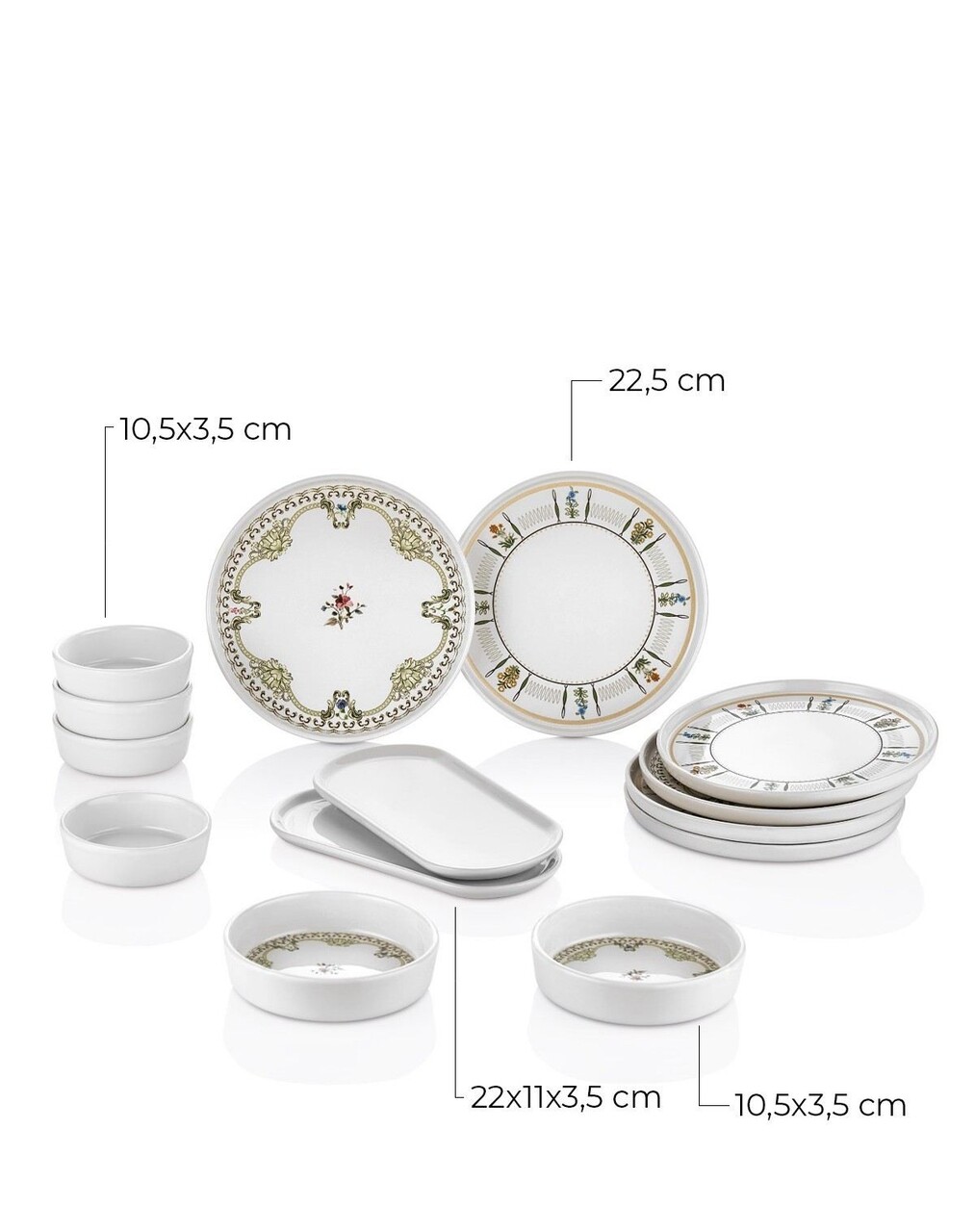 Set de mic dejun (14 piese)Farfurie: 20 cm (6 piese)Farfurii: 22 x 11 x 3,5 cm (2 piese)Bol cu gem: 10,5 x 10,5 x 3,5 cm (4 piese)Bol cu brânză: 13 x 13 x 3,5 cm (2 piese)