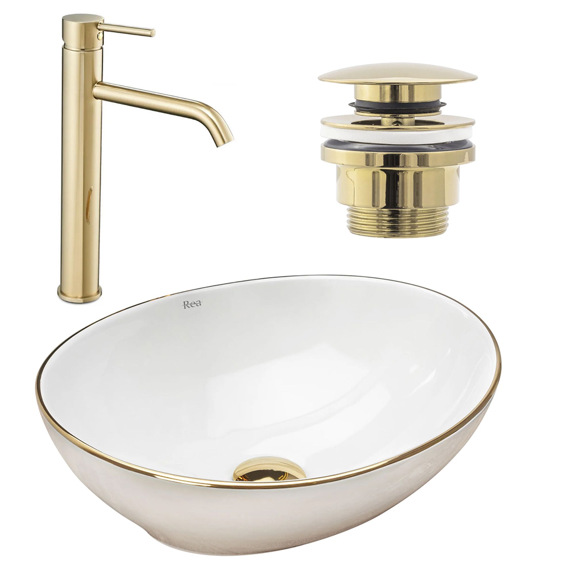 Set lavoar Sofia gold edge + baterie inalta Lungo gold + dop universal gold