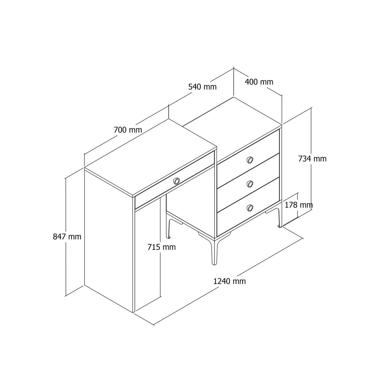 Masa de machiaj Hanah Home Lizbon 556 Alb este alegerea perfectă pentru un spațiu elegant și funcțional. Cu o grosime de 18 mm, această masă oferă un design modern, completat de un mâner din plastic și picioare din metal rezistente. Dimensiunile sale sunt ideale pentru orice cameră: lățime de 124 cm, înălțime de 84,7 cm și adâncime de 40 cm, iar înălțimea picioarelor de 17,8 cm asigură confortul necesar. Aduce un plus de stil și organizare pentru ritualul tău de frumusețe, fiind un element indispensabil în orice dormitor.