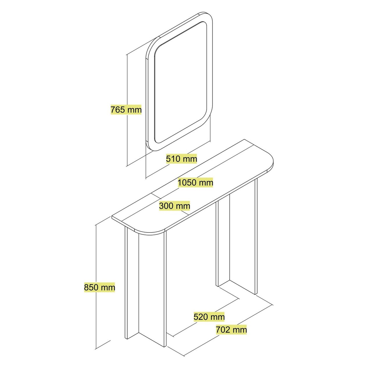 Masa de machiajGrosime: 18 mmLatime: 105 cm Inaltime: 85 cm Adancime: 30 cmOglinda decorativa: 76 x 51 cmGreutate maxima suportata: 10 kg