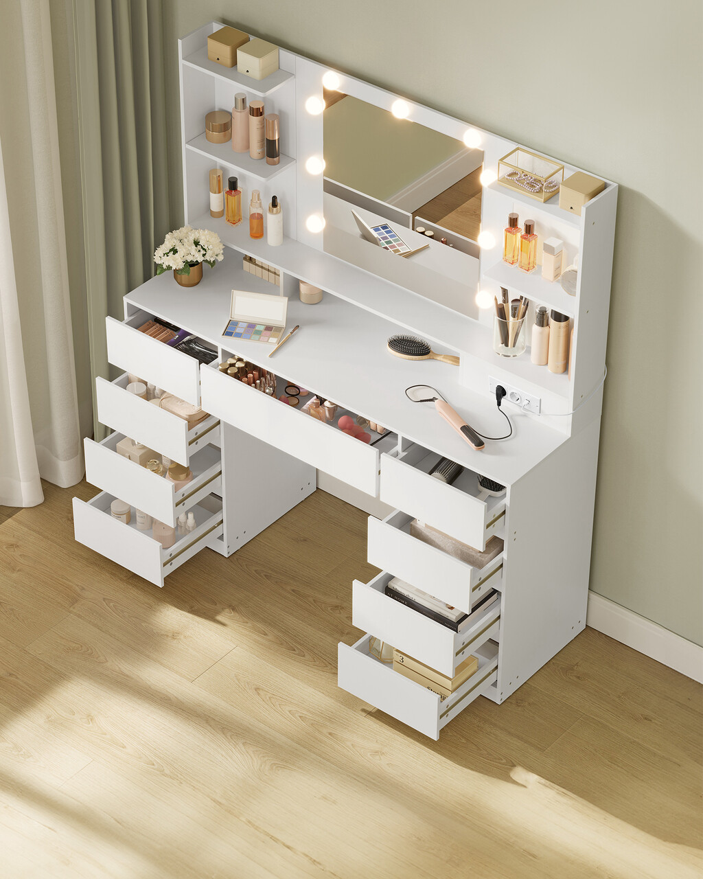 Masa de toaleta KAILYN cu oglinda iluminataDesign modern minimalistColectia KAILYN imbina culoarea alba, liniile curate si sertarele fara manere pentru a crea un decor elegant si armonios in dormitor sau dressing.Montaj fara unelteSistemul inovator permite fixarea sinelor sertarelor printr-un mecanism de tip click, fara a folosi suruburi sau unelte.Spatiu generos de depozitareMasa dispune de un blat lat de 107 cm, 9 sertare si 8 compartimente deschise pentru organizarea eficienta a produselor de machiaj si ingrijire.Oglinda cu iluminare reglabilaCele 9 becuri din jurul oglinzii ofera 3 temperaturi de culoare – rece, naturala si calda – iar luminozitatea poate fi ajustata pentru machiaj perfect in orice moment al zilei.Statie practica de incarcareMasa include 2 prize AC, 1 port USB-A si 1 port USB-C pentru incarcarea telefonului sau alimentarea aparatelor de styling.SpecificatiiCuloare: Alb CloudMaterial: PAL, MDF, oglindaDimensiuni: 40 x 107 x 144 cm (D x l x H)Continut pachet1 x masa de toaleta1 x kit accesorii1 x sistem anti-rasturnare1 x instructiuniNota VASAGLEScaunul pentru masa de toaleta nu este inclus.Pentru siguranta, fixeaza masa de toaleta de perete folosind sistemul anti-rasturnare inclus.