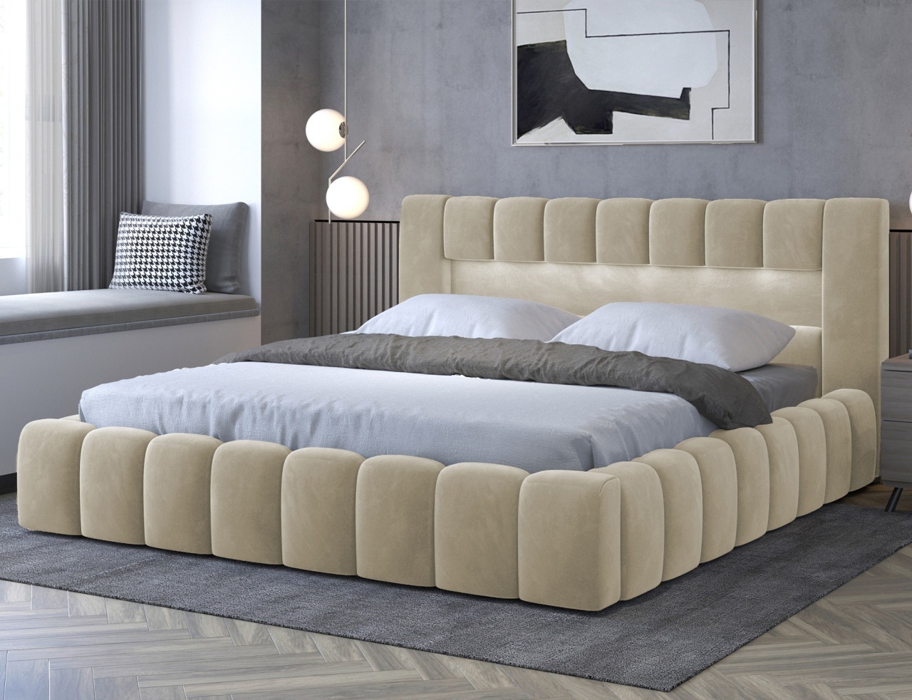 Patul Lamica 160x200 cm Monolith 04 cu somieră de lemn îmbină confortul cu un design glamour, fiind un element original în orice dormitor. Cu o tetieră înaltă și părți laterale dotate cu spumă suplimentară, acest pat oferă un suport excelent și un aspect sofisticat. Dimensiunile sale generoase (182 cm lățime, 232 cm adâncime și 90 cm înălțime) asigură un spațiu de odihnă ideal, iar înălțimea șezutului de 30 cm facilitează accesul. Patul nu este montat, dar asamblarea este rapidă și simplă. Personalizabil, permite alegerea culorii și materialului dintr-o paletă variată.