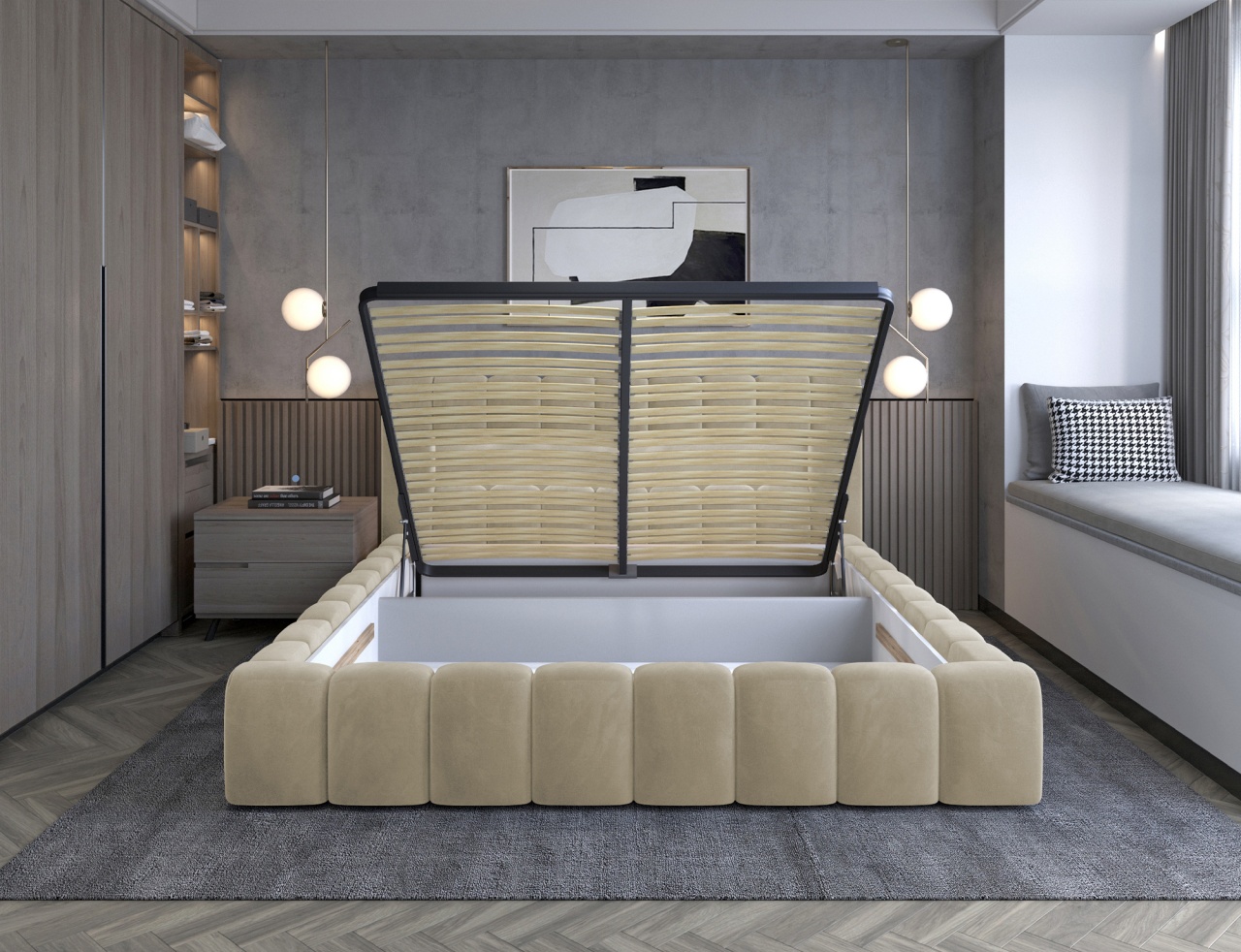 Patul Lamica 160x200 cm Monolith 04 cu somieră metalică combină confortul cu un design glamour, impresionând prin forma sa originală. Dotat cu o tetieră înaltă și părți laterale căptușite cu spumă suplimentară, acest pat oferă un suport excelent pentru odihnă. Dimensiunile sale sunt de 182 cm lățime, 232 cm adâncime și 90 cm înălțime, cu o înălțime de șezut de 30 cm. Montarea este rapidă și ușoară, iar produsul este personalizabil, permițând alegerea culorii și materialului dintr-o paletă variată, în funcție de preferințele clientului.