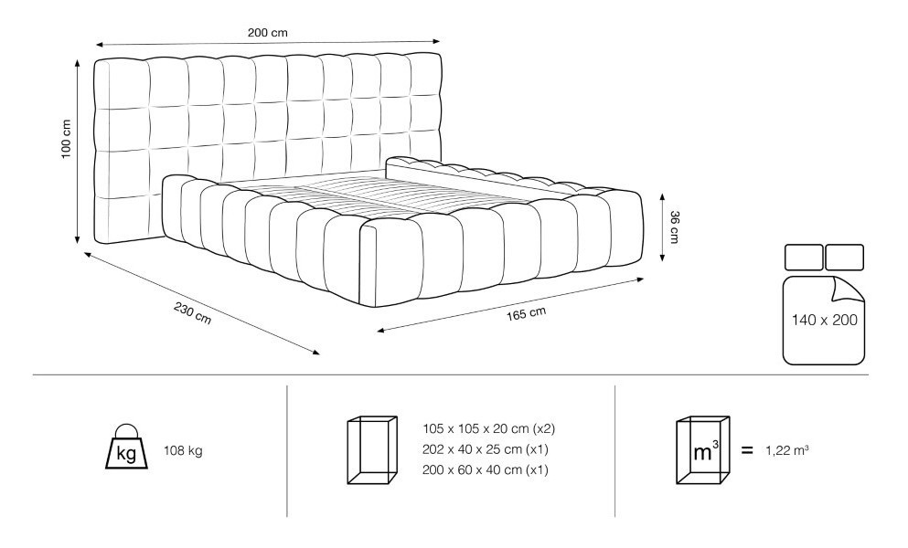 Patul tapițat catifea Bali T – 140×200 cm se remarcă printr-un design elegant, îmbinând formele geometrice cu o țesătură clasică pe șezut și spătar. Tablia sa oferă suport ideal pentru spate, iar proporțiile perfecte îl fac esențial în orice spațiu. Cu dimensiuni de 230 cm lungime, 200 cm lățime și 100 cm înălțime, acest pat dispune de o somieră cu sistem de ridicare hidraulic și o capacitate maximă autorizată de 200 kg. Structura este realizată din lemn masiv, PAL, MDF și spumă poliuretanică, iar picioarele din plastic sunt de 3 cm. Asamblarea este rapidă, în doar 60 de minute, iar produsul este personalizabil în funcție de preferințele clientului. Salteaua nu este inclusă.