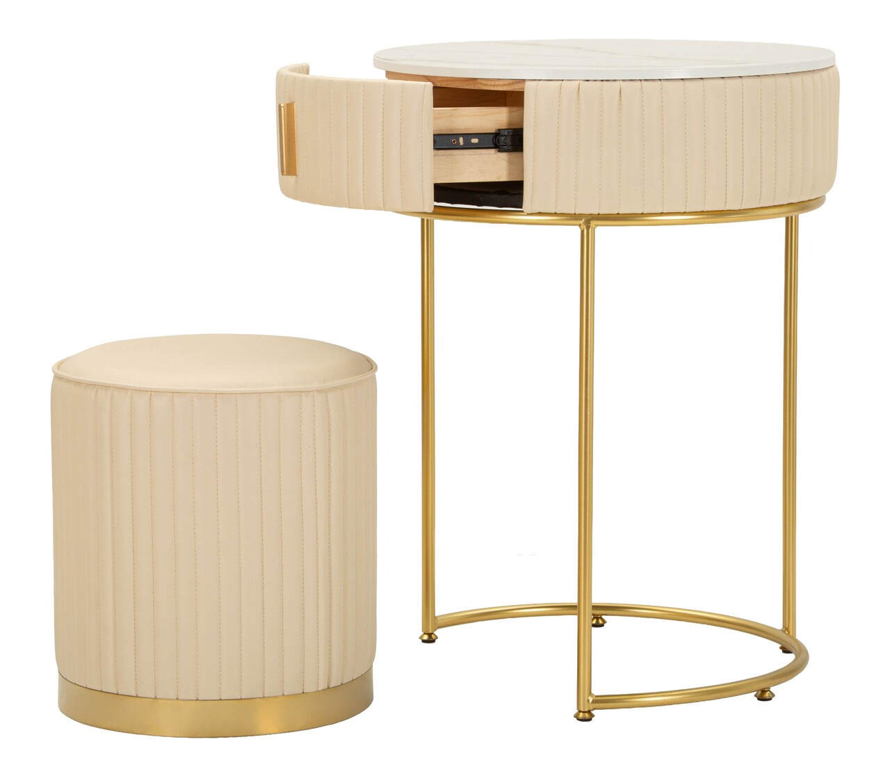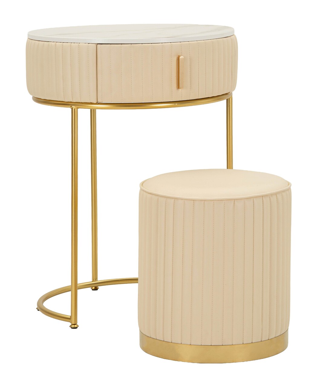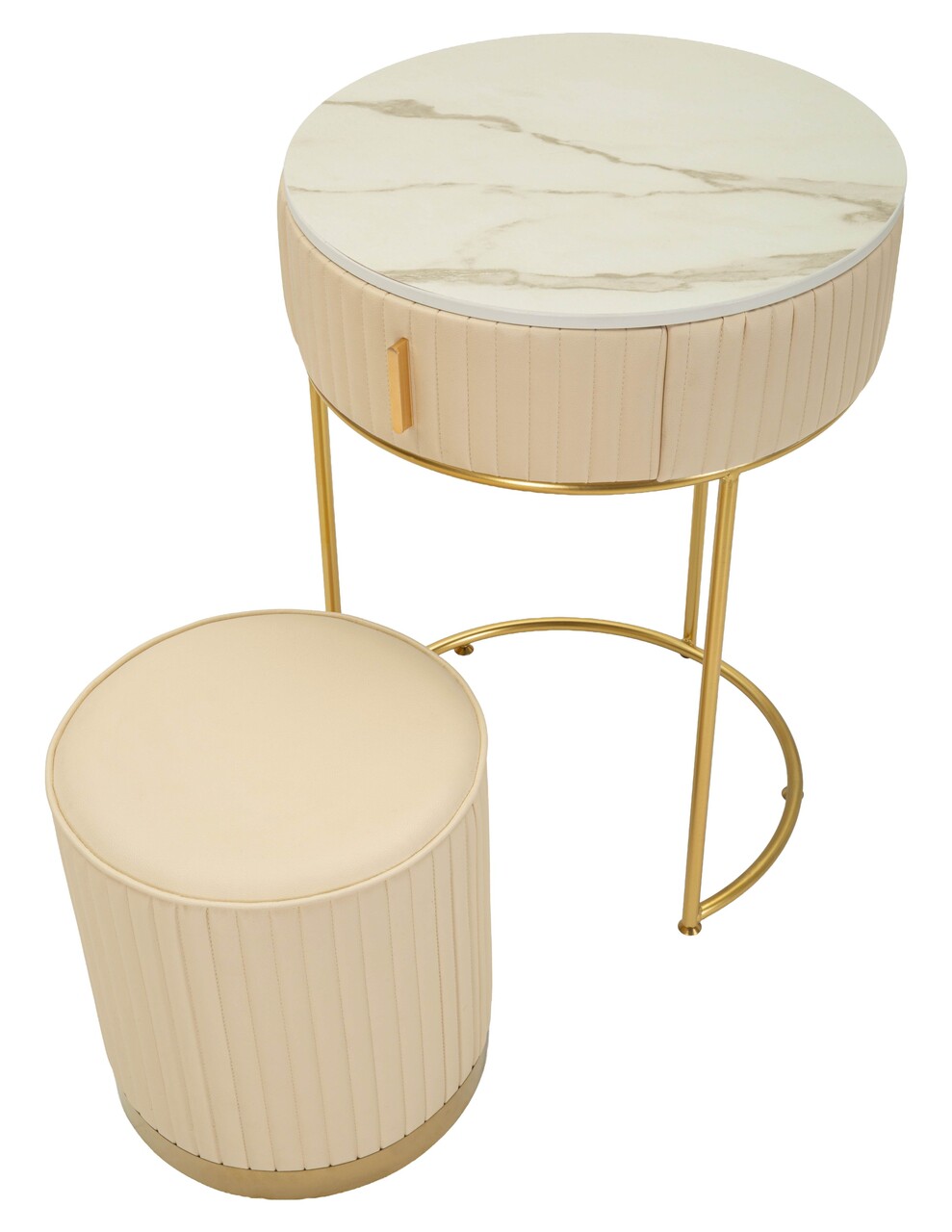 O mica bijuterie multifunctionala care imbina eleganta cu functionalitatea. Designul rotund si baza aurie aduc lumina si rafinament, fiind ideal atat ca masa de toaleta, cat si ca piesa decorativa de accent.Compozitie material: lemn de pin, MDF, burete, piele ecologica din poliuretan, metal.Setul include:1 masuta dressing cu dimensiunile Ø52 x 70 cm;1 taburet cu dimensiunile Ø36 x 39 cm.