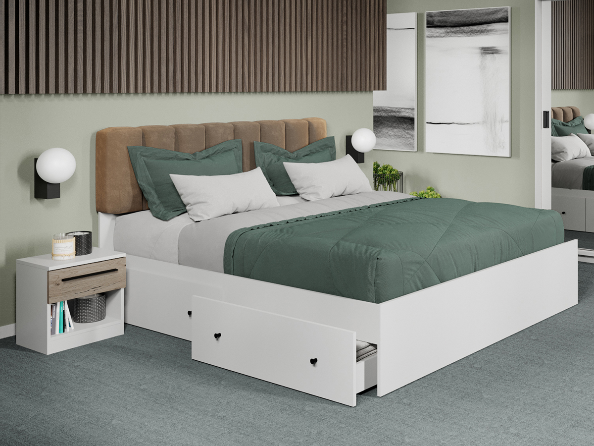 Setul de mobilă dormitor Odin Alb/San Remo cu oglindă C14 redefinește eleganța și funcționalitatea, aducând un aer modern în spațiul dumneavoastră personal. Patul matrimonial complet alb, disponibil în trei dimensiuni și opțiuni de tapiserie, oferă confort și stil, iar posibilitatea de depozitare prin sertare îl face extrem de practic. Dulapul cu uși glisante, disponibil în diverse culori, maximizează spațiul, iar noptierele și comoda cu design modern sunt ideale pentru organizarea eficientă a obiectelor. Materialele de calitate și detaliile elegante creează o atmosferă caldă și primitoare, perfectă pentru relaxare.