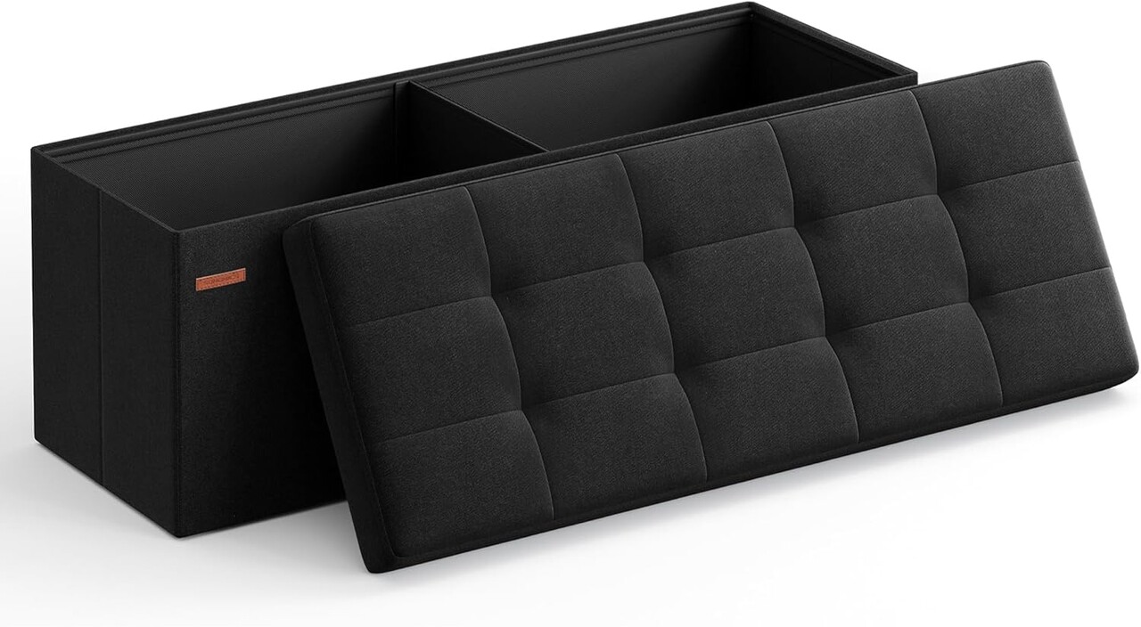 Bancheta cu spațiu de depozitare Songmics, cu dimensiuni de 110 x 38 x 38 cm și capacitate maximă de 300 kg, oferă un design elegant și confortabil. Suprafața din țesătură tip in, capitonată, asigură un confort pe termen lung, în timp ce structura robustă din MDF și întăriturile metalice conferă durabilitate. Cu un volum generos de 131 L, este ideală pentru depozitarea cărților, hainelor sau păturilor. Separatorul detașabil facilitează organizarea, iar designul pliabil permite economisirea spațiului. Poate fi utilizată ca taburet, ladă de depozitare sau suport pentru picioare. Culoare: negru cerneală.
