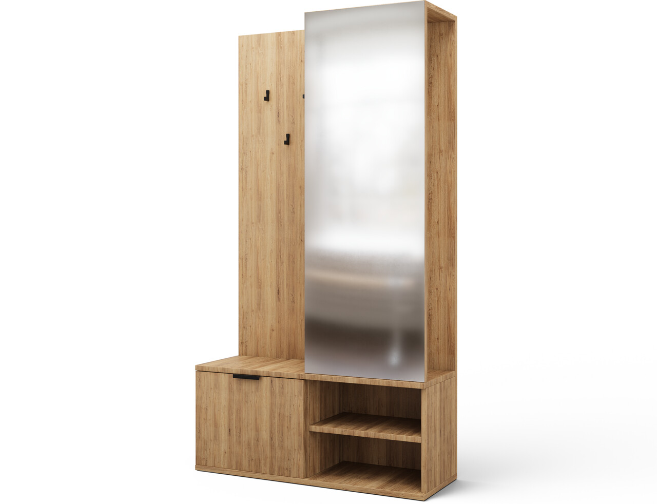 Dulapul Oturra este o piesa de mobilier moderna si supla care combina intr-un singur ansamblu elegant un cuier, o oglinda si un spatiu pentru incaltaminte. Cu dimensiunile sale se potriveste foarte bine chiar si intr-un hol ingust, ajutand la mentinerea ordinii in zona de intrare. In partea superioara se afla o bara pentru umerase destinata gecilor si paltoanelor, precum si un maner metalic pentru accesorii, iar zona inferioara ofera un dulap practic si doua polite pentru pantofi sau alte obiecte utile. Dulapul Oturra este realizat din PAL laminat rezistent: fronturile, carcasa si spatele/elementele interioare sunt din acelasi material, iar muchiile sunt protejate cu finisaj PVC, ceea ce creste rezistenta la deteriorare si usureaza curatarea. Grosimea placii carcasei si a politelor este de 16 mm, iar greutatea totala de 53 kg asigura stabilitate si durabilitate pentru multi ani. Este alegerea ideala daca sunteti in cautarea unei garderobe functionale pentru hol, cu oglinda, bara pentru haine si spatiu pentru pantofi, intr-un stil minimalist.Dimensiuni specificeLungime: 100 cmLatime: 35 cmInaltime: 180 cmLungime oglinda: 50 cmAdancime dulap: 30.5 cmAdancime sezut: 33 cmLungime sertar: 50 cmInaltime raft: 16 cmDimensiuni maner: 11.7x3.5 cmProdusul necesita asamblare.