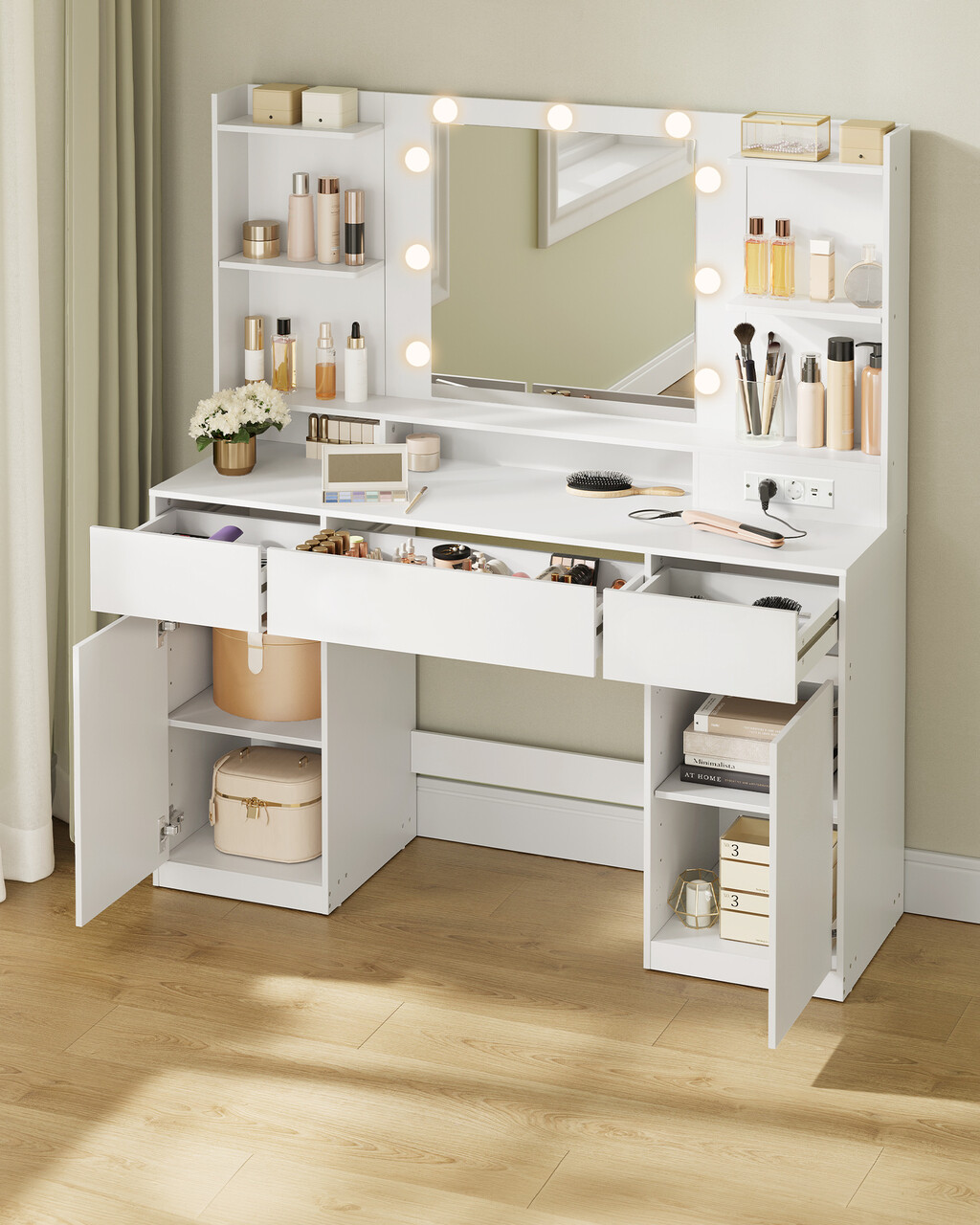 Masa de toaleta cu oglinda LED prize si porturi USB Kailyn Vasagle 107x40x144 cm PAL/MDF alb cloud
