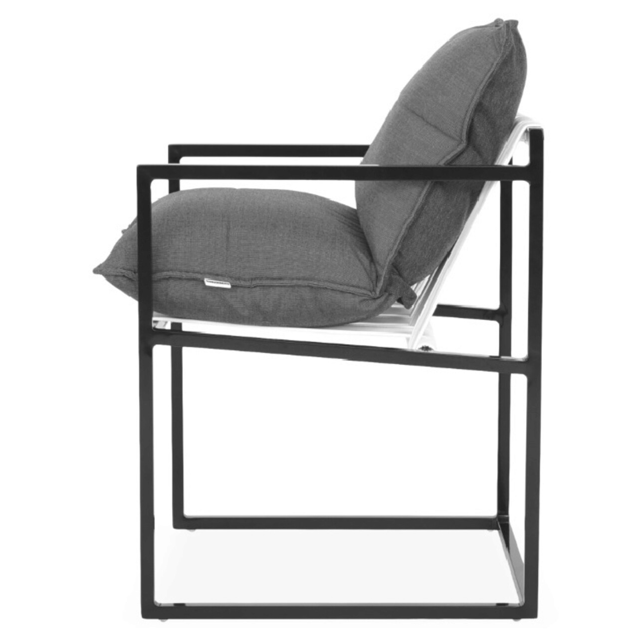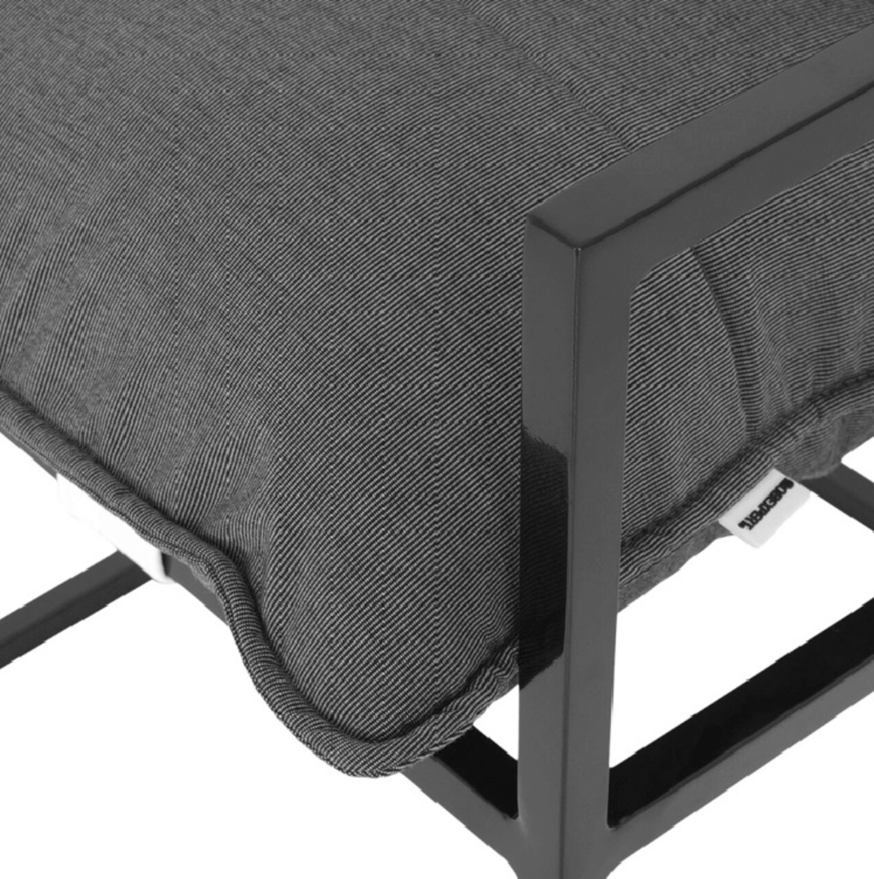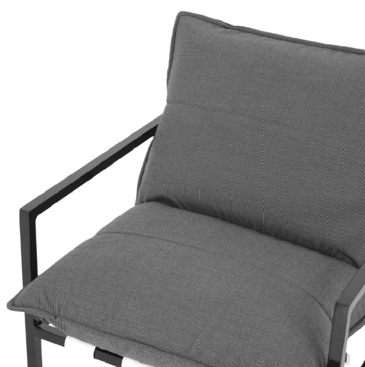 Realizat din structura solida de aluminiu vopsita in camp electrostatic. Sezutul si spatarul sunt realizate din benzi de piele si include perna imbracata cu tesatura Sunbrella impermeabila si cu protectie garantata impotriva decolorarii.