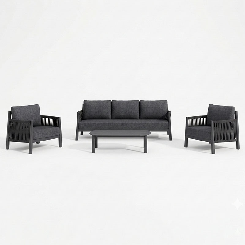 Set de grădină Feralda 4 piese — Eleganță și confort pentru exterior (218x79x73 cm) Design și materiale de calitate Feralda impresionează printr-o siluetă modernă, finisaje în gri închis și un joc textural între cadru metalic mat și șnur din poliester împletit, care conturează brațele și spătarele. Tapițeria în nuanță antracit, cu perne din material textil 340gsm, oferă o notă de rafinament și confort. Setul se potrivește armonios cu piese din Lemn PAL sau Lemn MDF pentru a crea un ambient exterior cald și echilibrat. Funcționalitate și organizare Proiectat pentru socializare și relaxare, setul include 2 fotolii, 1 canapea 3 locuri și o măsuță de cafea — ideal pentru conversații îndelungate pe terasă sau în grădină. Dimensiunile principale: canapea 218x79x73 cm , fotolii 78x79x73 cm și măsuța 120x65x34 cm , oferind spațiu generos pentru confort și organizare. Pernele ergonomice și suprafața de sticlă a măsuței completează funcționalitatea practică și estetică a setului. Montaj și întreținere Setul se livrează neasamblat , în pachete separate, cu instrucțiuni detaliate de montaj și toate accesoriile de montaj incluse. Pernele au un material tratat pentru rezistență UV și respingerea apei, dar nu sunt proiectate pentru expunere prelungită la ploi torențiale. Curățarea se face ușor cu o lavetă moale și detergent blând; cadrul din Metal și blatul de sticlă își păstrează frumusețea cu întreținere minimă. Comandă acum și transformă-ți spațiul! Adaugă o notă de eleganță și funcționalitate terasei sau grădinii tale — comandă setul Feralda acum și creează-ți colțul preferat pentru momente de relaxare și socializare. Detalii tehnice complete Dimensiuni și greutate Dimensiuni produs: 218 x 79 x 73 cm Greutate produs: 111.2 kg Materiale și caracteristici Material corp: Metal (cadru din aluminiu), șnur din poliester, sticlă Material finisaj/tapițerie: Material textil 340gsm tratat, spumă, Plastic [Tip] (PP cotton) Culoare: Gri închis Număr pachete: 2 Montaj și pachet Stare asamblare: Neasamblat Conținut pachet: 1 x Canapea 3 locuri, 2 x Fotolii, 1 x Măsuță de cafea, Accesorii de montaj, Instrucțiuni Manual de asamblare: Descarcă aici Stil și origine Stil: Modern Destinație recomandată: Grădină / Terasă