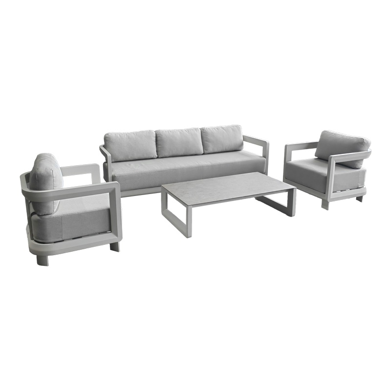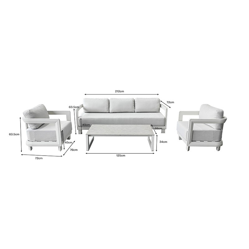 Set de grădină 4 buc. Jenora - Oază de relaxare în aer liber Design și materiale de calitate Setul de grădină Jenora se remarcă printr-un design elegant și modern, fiind realizat dintr-un cadru din metal de înaltă calitate, cu o finisare în nuanță de beige . Tapițeria este dintr-un material textil de calitate superioară, în nuanță de gri deschis , care adaugă un aer sofisticat. Acest set este perfect pentru a crea un colț de relaxare în grădină, pe terasă sau în curte. Funcționalitate și organizare Setul Jenora include 2 fotolii confortabile, un canapea cu 3 locuri și o masă de cafea, toate concepute pentru a oferi un confort optim. Dimensiunile canapelei sunt de 212 cm lungime, 72 cm lățime și 63.5 cm înălțime, iar fotoliile au dimensiuni de 76 cm lungime, 72 cm lățime și 63 cm înălțime. Masa de cafea măsoară 125 cm lungime, 68 cm lățime și 34 cm înălțime, oferind suficient spațiu pentru băuturi și gustări. Montaj și întreținere Produsul este livrat neasamblat, în ambalaj de fabrică, și include un ghid detaliat de asamblare . Se curăță ușor cu o lavetă moale , iar materialele sunt tratate pentru a rezista la razele soarelui și umiditate, având proprietăți de respingere a apei. Este important de menționat că nu este destinat expunerii prelungite la ploaie puternică sau apă stagnantă. Comandă acum și transformă-ți spațiul! Nu rata ocazia de a adăuga un strop de eleganță și confort în aer liber! Comandă setul Jenora și bucură-te de momente de neuitat alături de cei dragi. Detalii tehnice complete Dimensiuni și greutate Dimensiuni produs: 212 x 72 x 63.5 cm Greutate produs: 71.2 kg Materiale și caracteristici Material corp: Metal Material finisaj/tapițerie: Material textil Culoare: Gri deschis Număr pachete: 1 Montaj și pachet Stare asamblare: Neasamblat Conținut pachet: 1 x Canapea, 2 x Fotolii, 1 x Masă de cafea, Accesorii de montaj, Instrucțiuni Manual de asamblare: Descarcă aici Stil și origine Stil: Modern Destinație recomandată: Grădină / Terasă / Curte