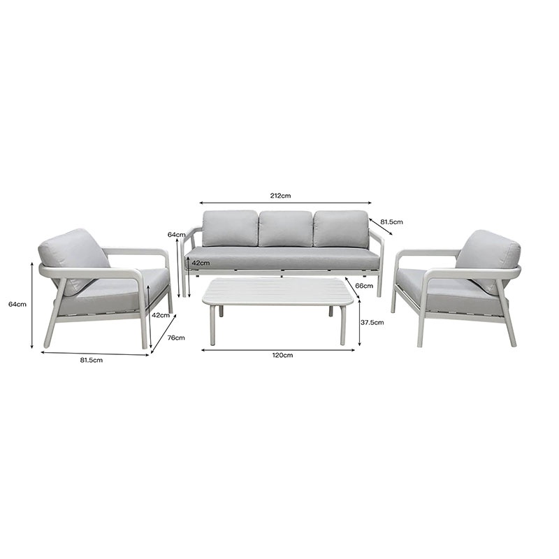Set de grădină 4 buc. Marlena - Oaza ta de relaxare Design și materiale de calitate Setul de grădină Marlena îmbină eleganța cu funcționalitatea , având un cadru din aluminiu de culoare bej, ce asigură rezistență la uzură și intemperii. Tapițeria din material textil de înaltă calitate, în nuanță de gri deschis, adaugă un aer modern și primitor, perfect pentru a crea un colț de relaxare în grădina ta. Funcționalitate și organizare Acest set include 2 poltrone confortabile, un canapea cu 3 locuri și un masă de cafea, toate concepute pentru a oferi confort și spațiu generos. Dimensiunile canapelei sunt de 212 cm lungime, 81.5 cm lățime și 64 cm înălțime, iar poltronele au dimensiuni de 76 cm lungime, 81.5 cm lățime și 64 cm înălțime, fiind ideale pentru a te bucura de zilele însorite și serile răcoroase. Montaj și întreținere Setul se livrează neasamblat, dar vine cu un ghid detaliat de asamblare pentru a facilita montajul. Întreținerea se face ușor, prin ștergerea cu o lavetă moale , asigurându-te că mobilierul tău rămâne mereu curat și îngrijit. Comandă acum și transformă-ți spațiul! Nu rata ocazia de a-ți transforma grădina într-o oază de relaxare! Comandă acum setul Marlena și bucură-te de momente de neuitat alături de cei dragi. Detalii tehnice complete Dimensiuni și greutate Dimensiuni produs: 212 x 81.5 x 64 cm Greutate produs: 56 kg Materiale și caracteristici Material corp: Aluminiu Material finisaj/tapițerie: Material textil Culoare: Gri deschis Număr pachete: 1 Montaj și pachet Stare asamblare: Neasamblat Conținut pachet: 1 x Canapea, 2 x Poltrone, 1 x Masă de cafea, Accesorii de montaj, Instrucțiuni Manual de asamblare: Descarcă aici Stil și origine Stil: Modern Destinație recomandată: Grădină / Terasă