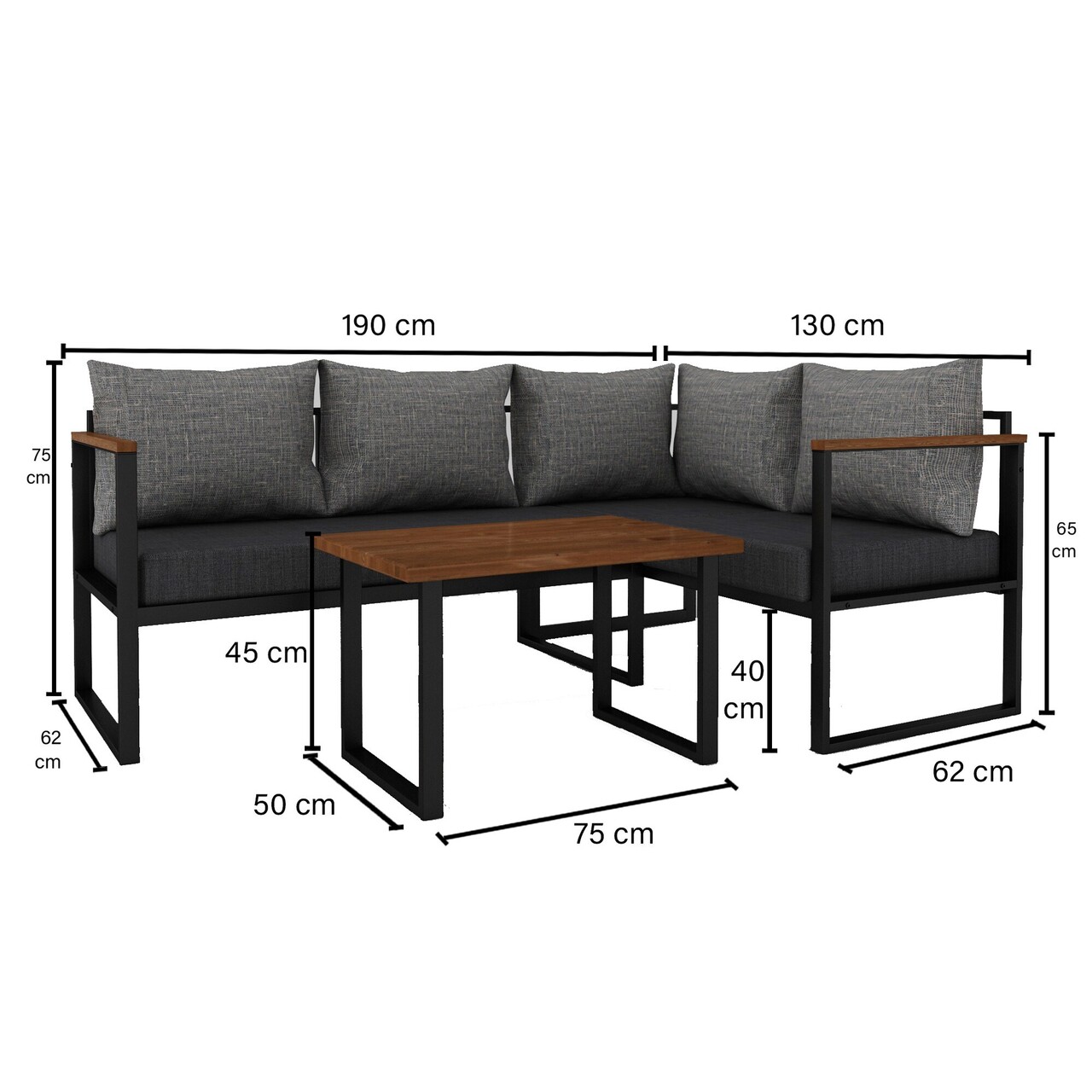 Set mobilier de gradinaTesatura: InPartea de sus a mesei de cafea: LemnSpuma 28 DNS pentru sezutDimensiunea canapelei de colt: Latime: 190 cm Inaltime: 75 cmAdancime: 130 cmDimensiune masuta de cafea: Latime: 75 cm Inaltime: 45 cm Adancime: 50 cm