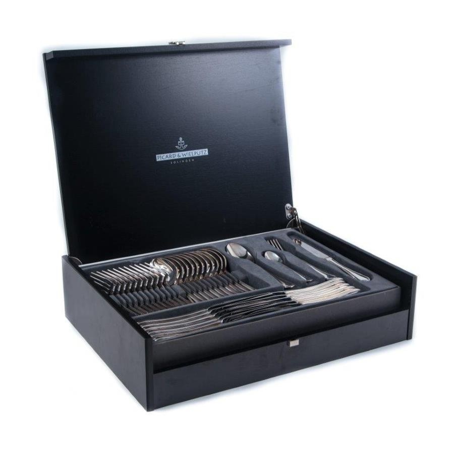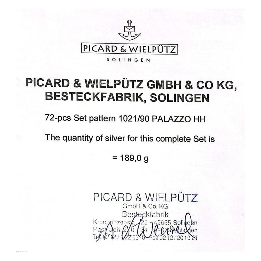Setul de tacamuri PALAZZO, fabricat din inox placat cu argint AG 90, este alegerea perfectă pentru cei care apreciază eleganța și rafinamentul. Destinat pentru 12 persoane, acesta include 72 de piese, fiecare marcate cu emblema producătorului german Picard & Wielputz, garantând astfel respectarea Standardului Internațional 90. Fiecare lingură și furculiță poartă un semn distinctiv ce atestă calitatea superioară a acestor tacâmuri. Alege PALAZZO pentru a adăuga o notă de lux meselor tale!