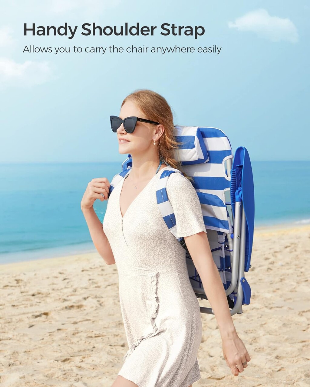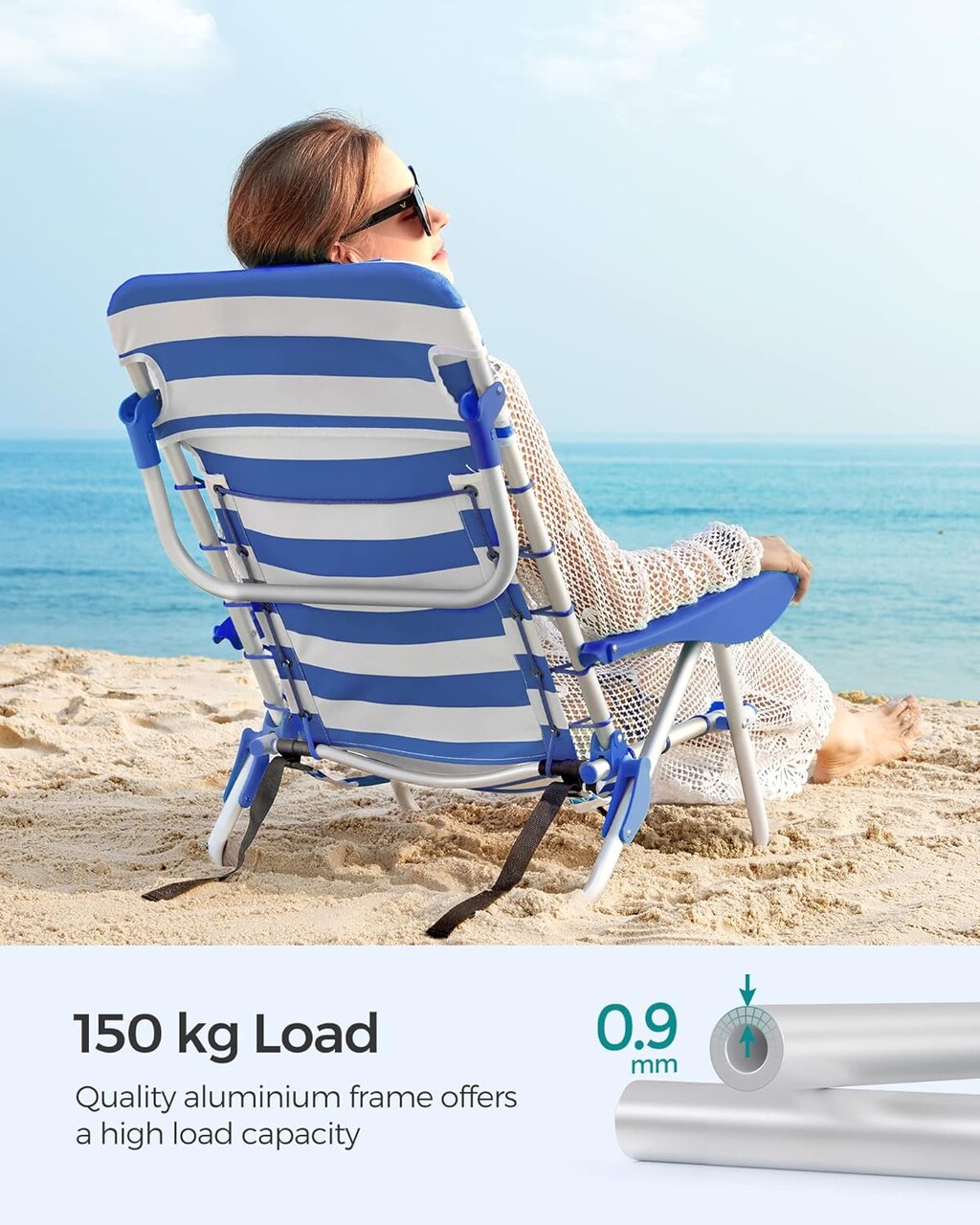 Scaun de plaja / camping Songmics se poate purta ca rucsac spatar reglabil max 150 kg albastru/alb