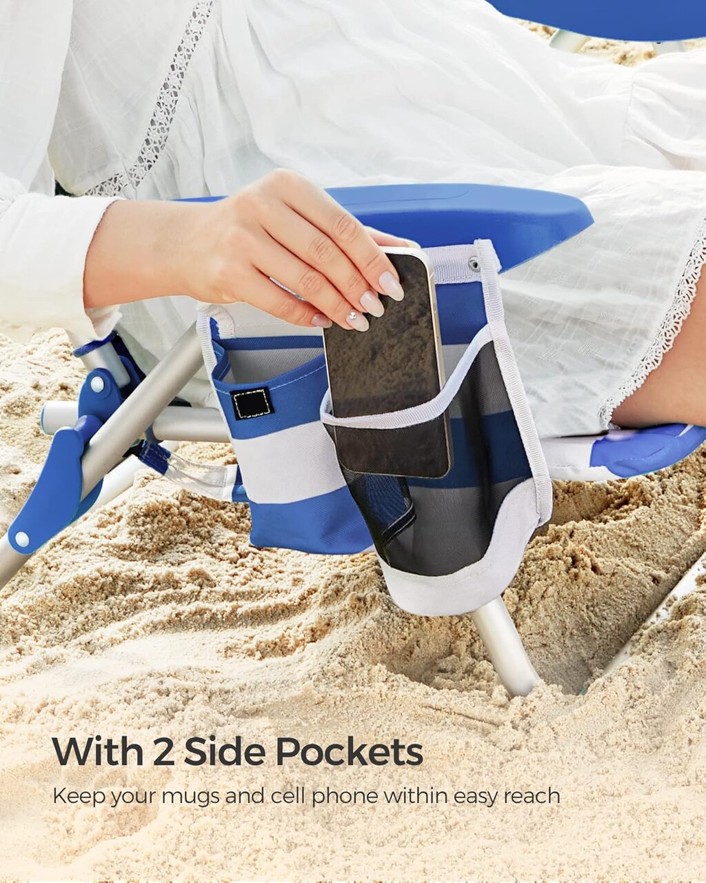 Confort optim la sedere: Spatar inalt de 65 cm, reglabil de la 110° la 180° (4 pozitii); dimensiune sezut: 48 x 39 cm (L x l); inaltime sezut: 21 cm.Portabil si pliabil: Scaunul de camping cantareste 3.1 kg si are curea pentru umar pentru transport usor. Cand este pliat, masoara 66.5 x 70 x 11 cm si incape in portbagaj.Capacitate 150 kg: Cadru din aluminiu rezistent; material Oxford 600D cu strat rezistent la apa, durabil.Usor de utilizat: Nu necesita asamblare. Deschide scaunul si este gata de folosire. Buzunarul din plasa tine bauturi, iar buzunarul textil telefonul sau servetele.Utilizare multipla: Potrivit pentru plaja, camping, pescuit la râu sau alte activitati in aer liber.Specificatii:Culoare: albastru si albMaterial: aluminiu, material OxfordDimensiune deschis: 68 x 63 x 75 cm (L x l x H)Dimensiune pliat: 66.5 x 70 x 11 cm (L x l x H)Dimensiune sezut: 48 x 39 cm (L x l)Inaltime spatar: 65 cmInaltime sezut: 21 cmCapacitate maxima: 150 kg