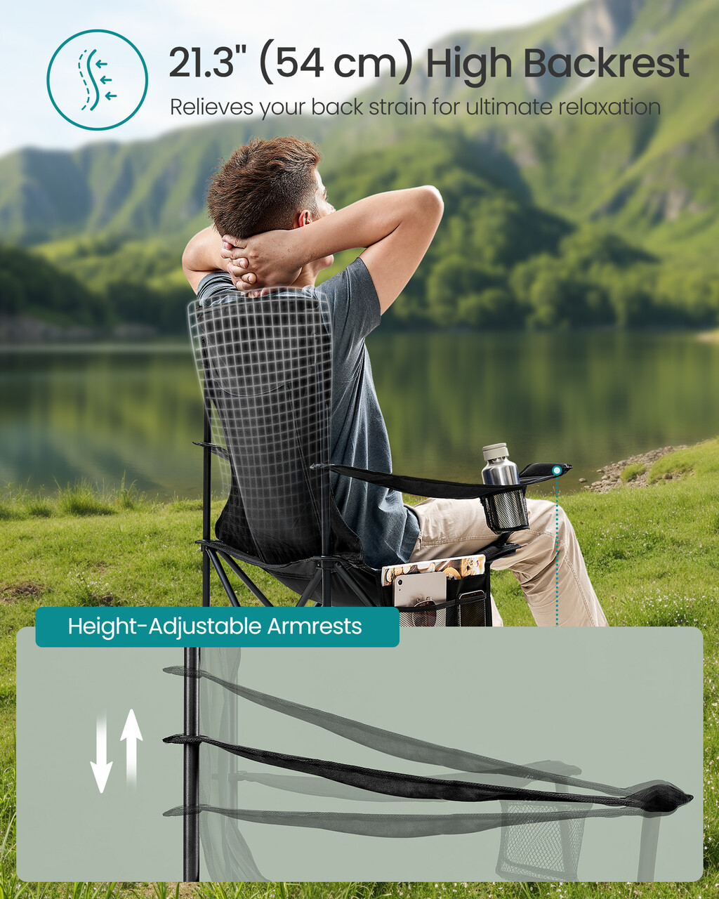 Uscare rapida si versatil: Spatarul din plasa din nylon este respirabil si se usuca rapid, fiind ideal pentru plaja, piscina, parc sau terasa.Sezut confortabil: Spatar inalt de 54 cm, sezut lat de 52 cm si brate reglabile pentru confort optim.Durabil si stabil: Cadru cu imbinari intarite si material 600D Oxford rezistent la apa si uzura pentru utilizare indelungata.Usor de transportat: Fiecare scaun cantareste doar 2.5 kg si se pliaza compact pentru depozitare in geanta inclusa.Dotari practice: Suport pentru bauturi si organizator textil pentru telefon sau alte obiecte.Confort si functionalitate: Setul de 2 scaune este ideal pentru camping, pescuit sau relaxare in aer liber.Specificatii:Culoare: negruMaterial: otel, material Oxford, plasa nylonDimensiune scaun: 51.5 x 86.5 x 97 cmDimensiune sezut: 52 x 52 cmInaltime spatar: 54 cmCapacitate maxima: 150 kg / scaunContinutul pachetului:2 x scaun camping2 x geanta transportNote:nu depasi capacitatea maximaasigura-te ca scaunul este complet deschis inainte de utilizareevita expunerea prelungita la ploaie si soare puternic
