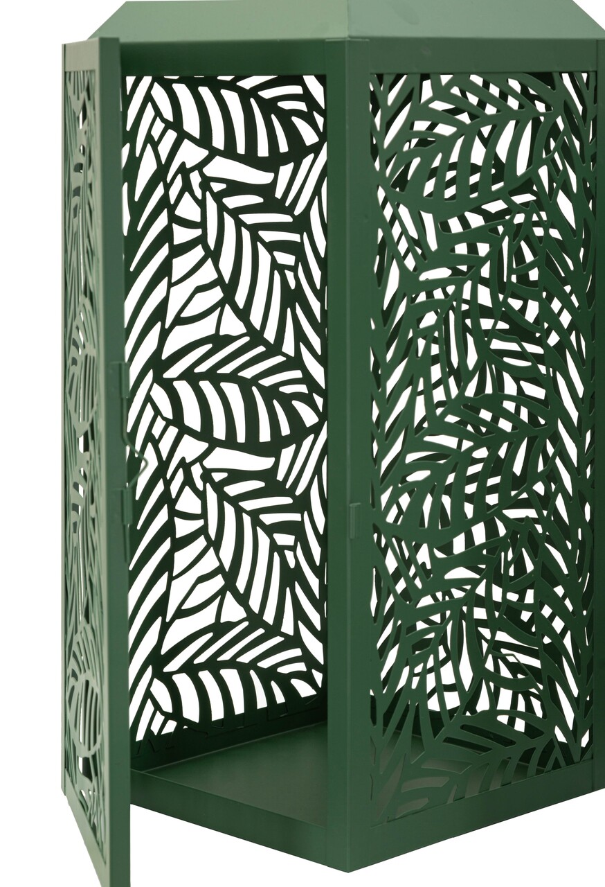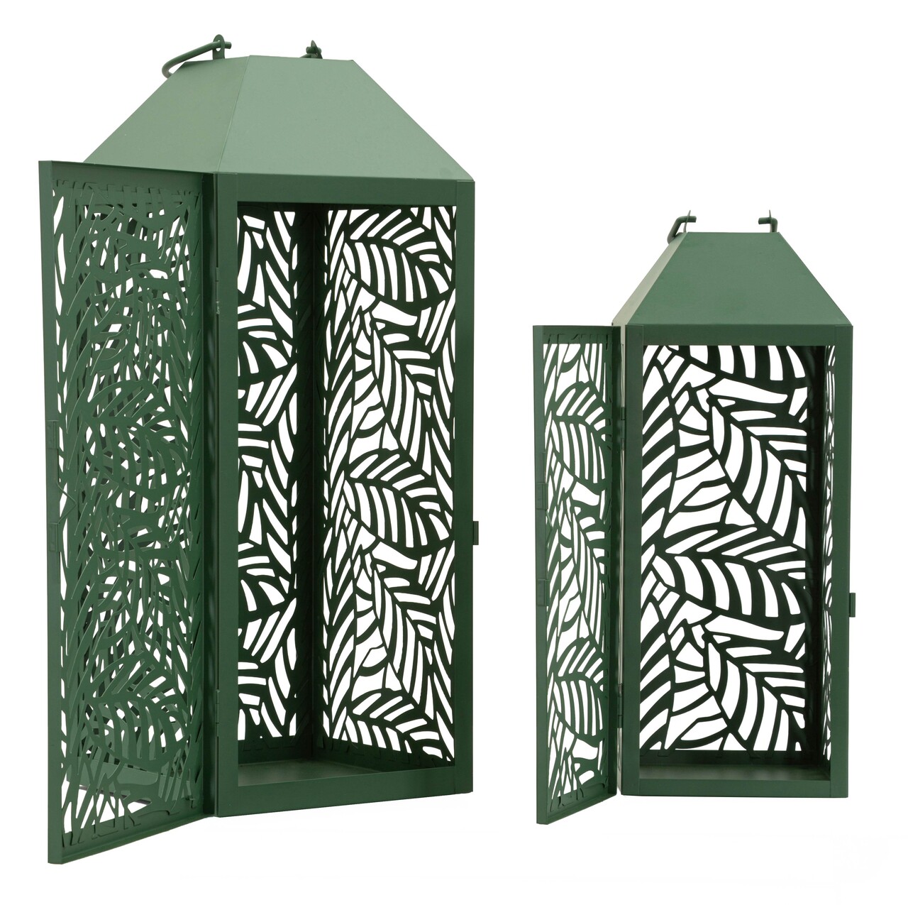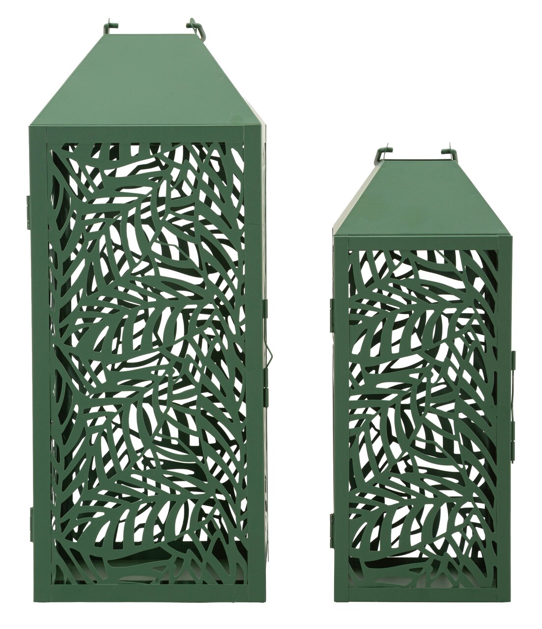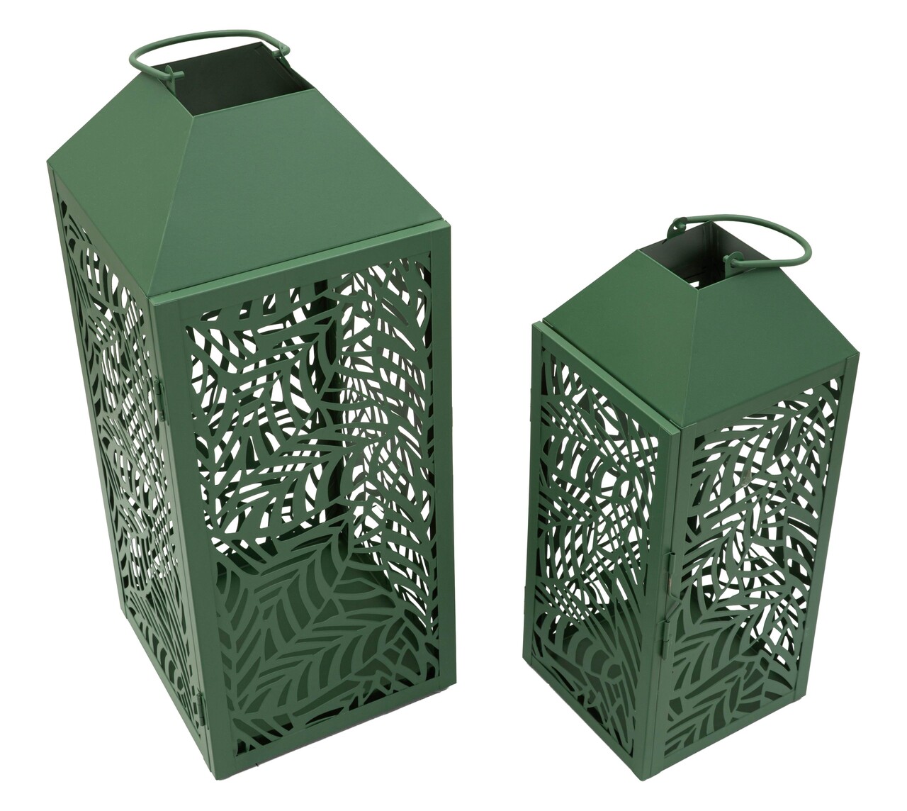 Set de doua felinare din metal vopsit cu decupaje decorative in forma de frunze. Lumina difuzata creeaza o atmosfera calda.Setul include:1 felinar cu dimensiunile 17.8x17.8x44 cm;1 felinar cu dimensiunile 13.8x13.8x34 cm.