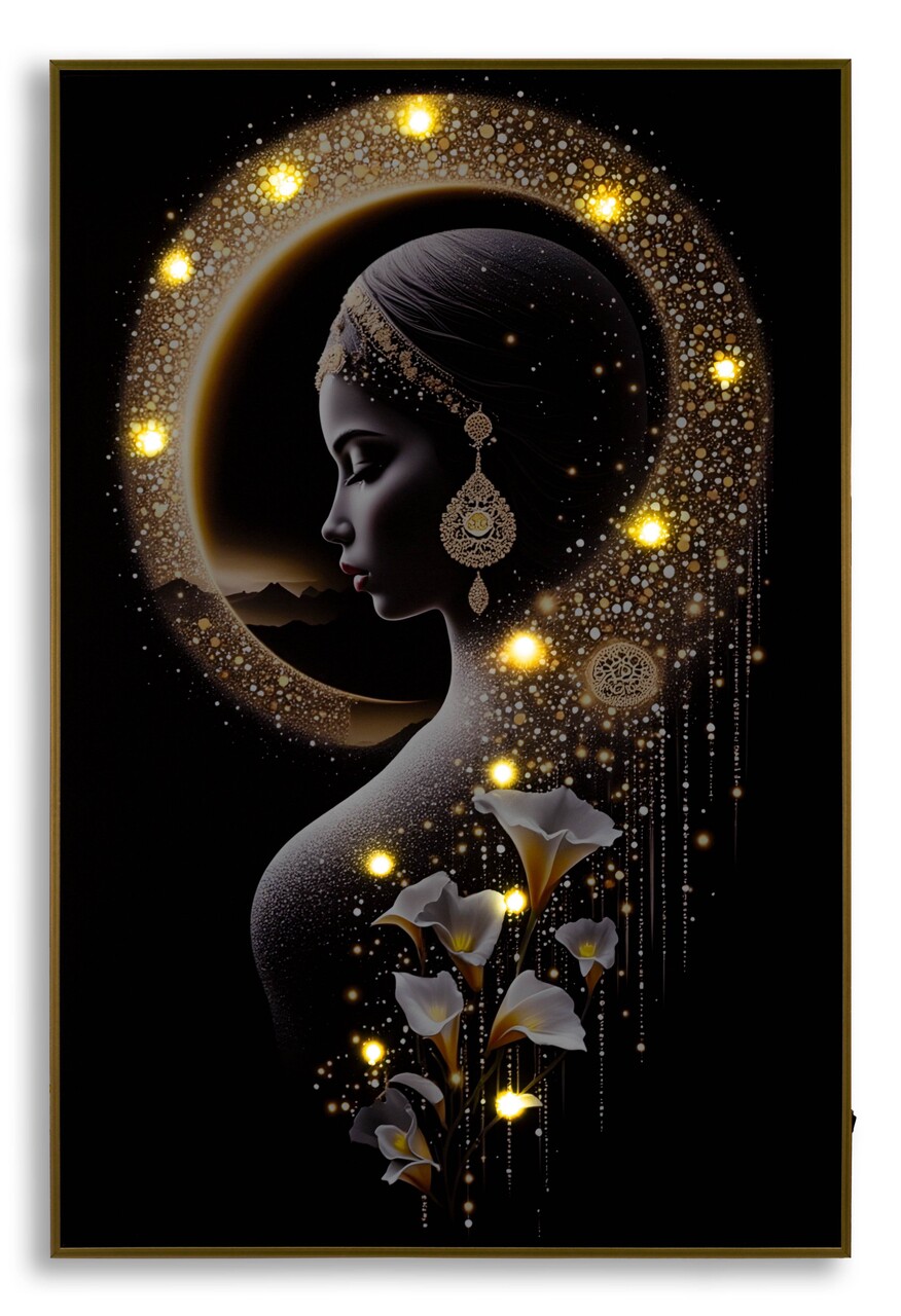 O silueta eleganta si rafinata, facuta si mai magica de lumina LED care o invaluieste. O lucrare ce emana gratie si spiritualitate, ideala pentru atmosfere unice.Tablou imprimat pe canvasPrevazut cu lumini LEDFunctioneaza cu 2 baterii de tip AA, neincluse.Compozitie material: lemn de brad, canvas, plastic.