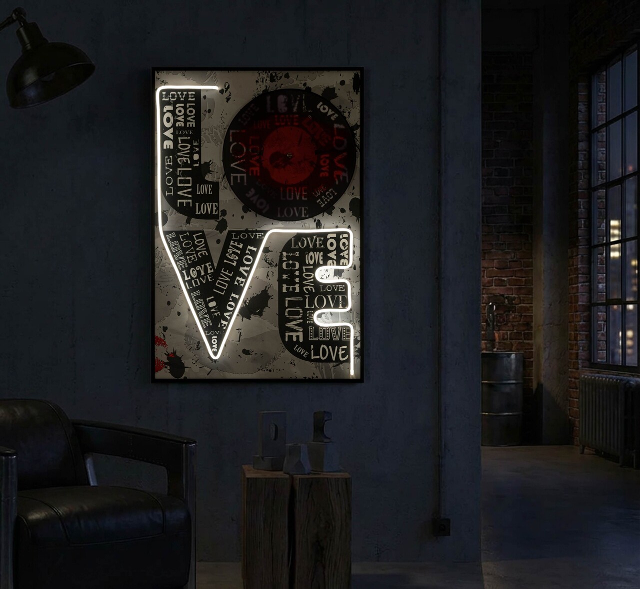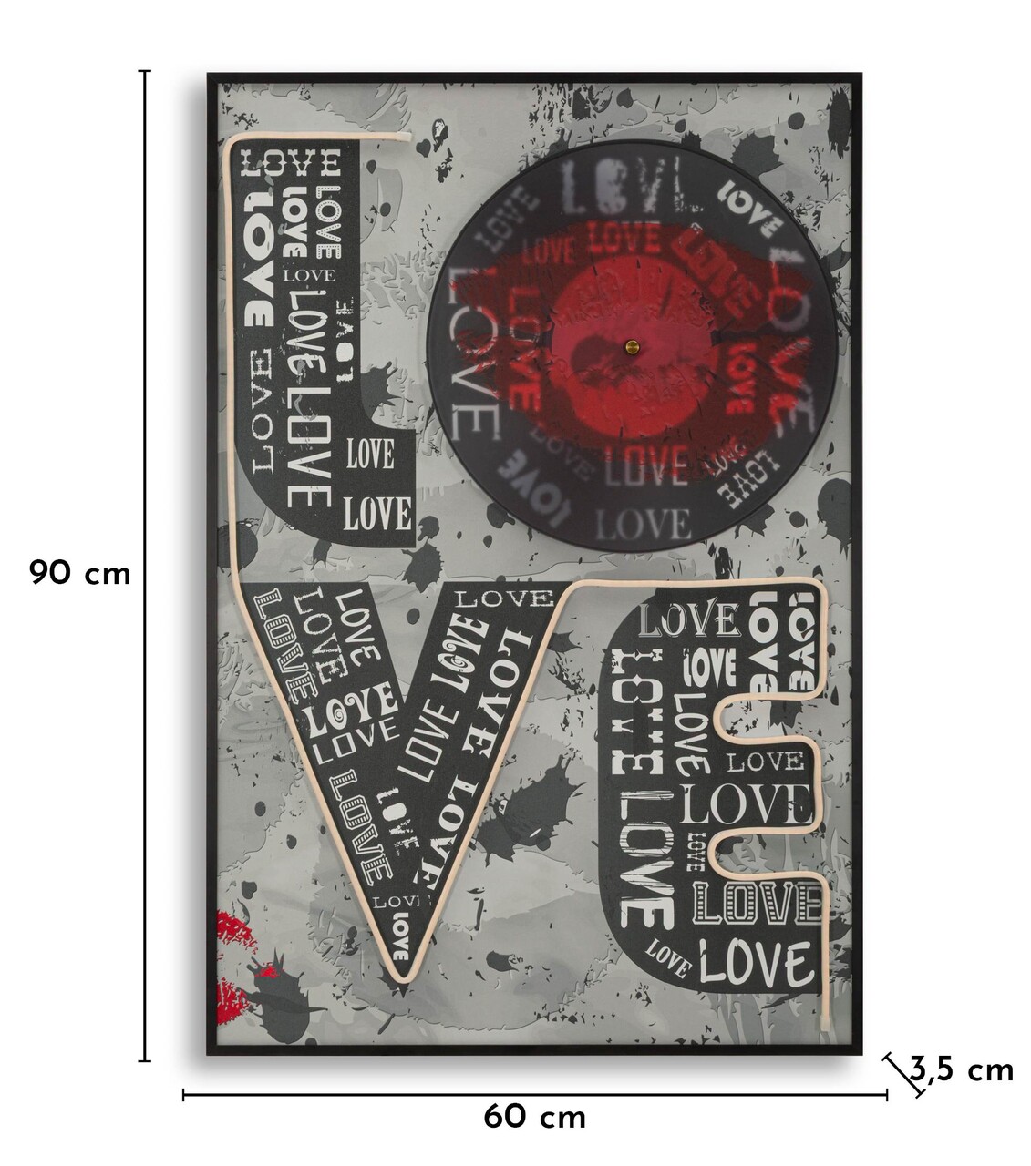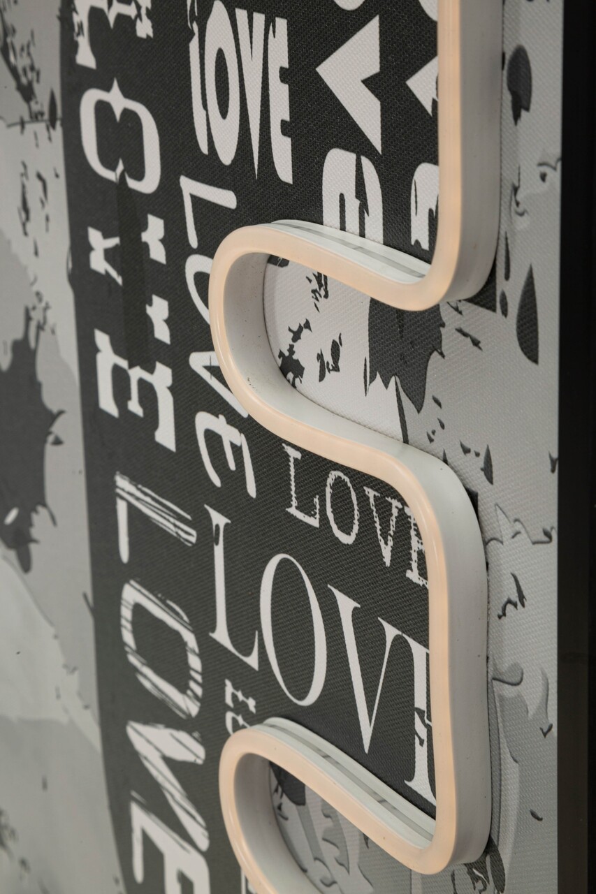 Cuvantul LOVE se aprinde prin LED-uri intre grafica urbana si detalii pop. O lucrare ce transmite energie pozitiva si un stil metropolitan de mare impact.Tablou imprimat pe canvasPrevazut cu lumini LED si aplicatii 3D din acrilicCompozitie material: canvas, plastic, MDF.