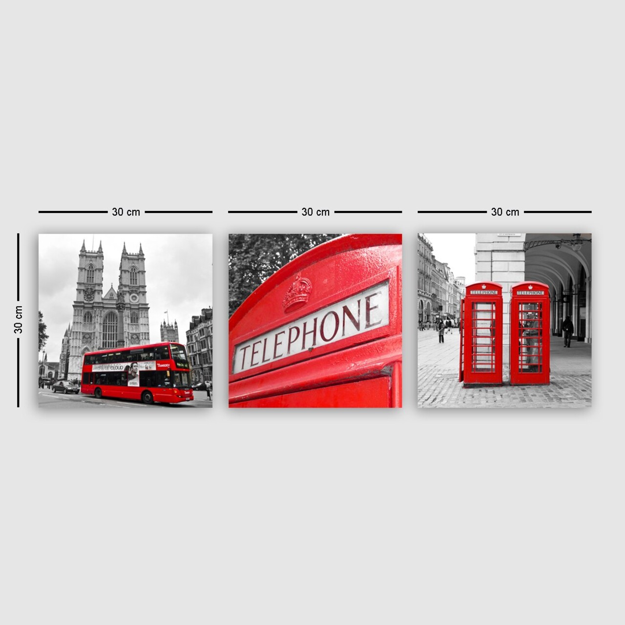 Tablou decorativ (3 piese)Cadru: Lemn (Grosime: 3 cm)Marime: 30 x 30 cm (3 piese)Marimea totala: 30 x 90 cm