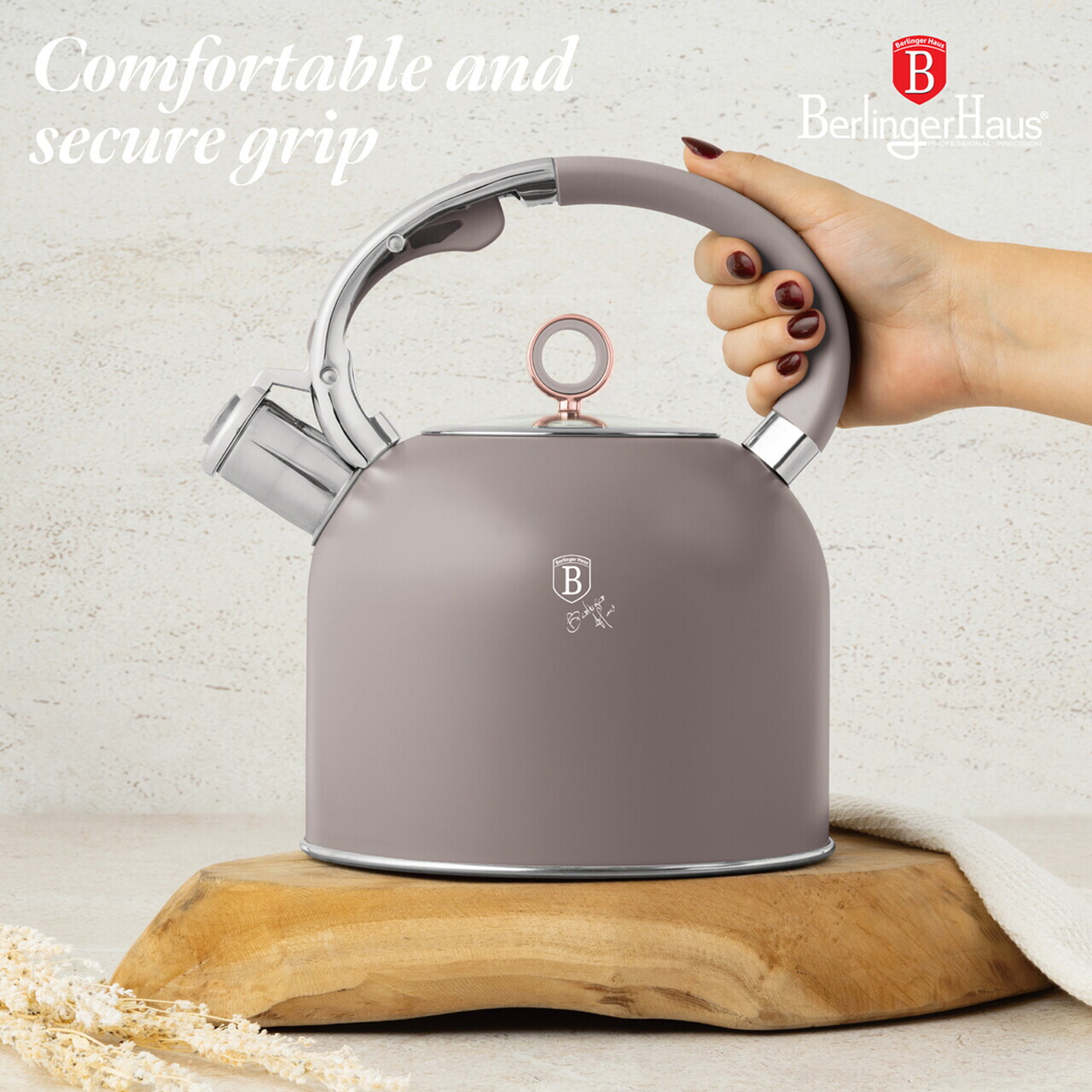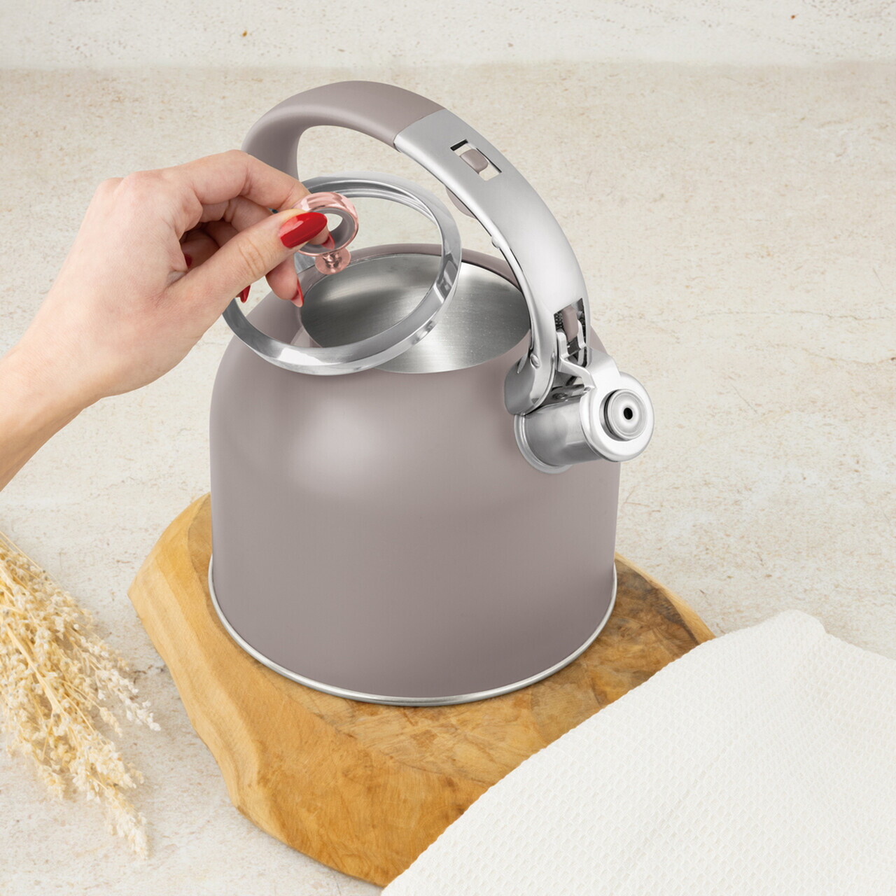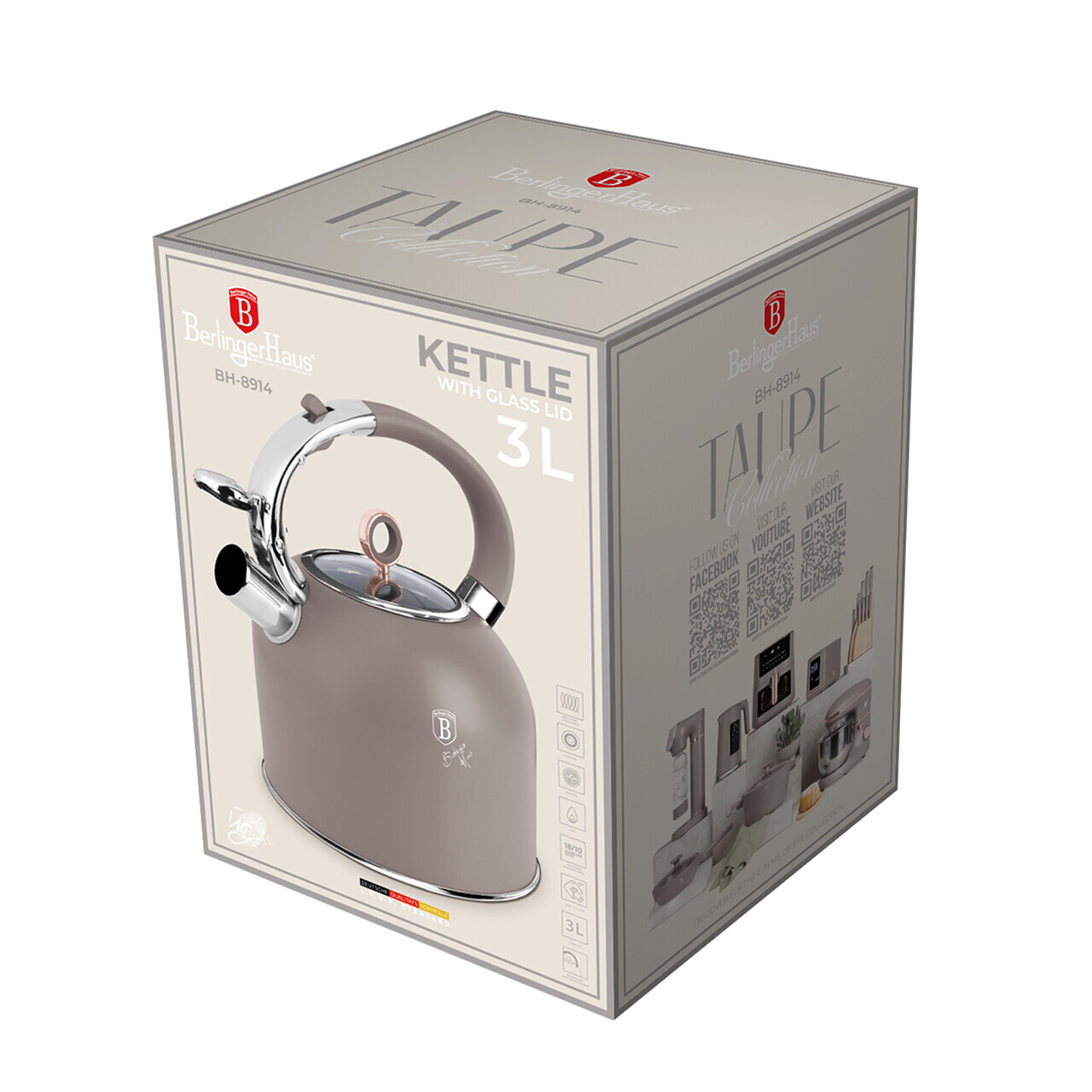 Maner ergonomic, moale la atingerePotrivit pentru inductiePotrivit pentru toate tipurile de pliteCapac din sticla securizata cu margine din otel inoxidabilConfortabil in utilizareUsor de curatatElegantMaterial: otel inoxidabil 18/10 cu acoperire pulbere mata, sticlaCapacitate: 3 LCuloare: taupe mat