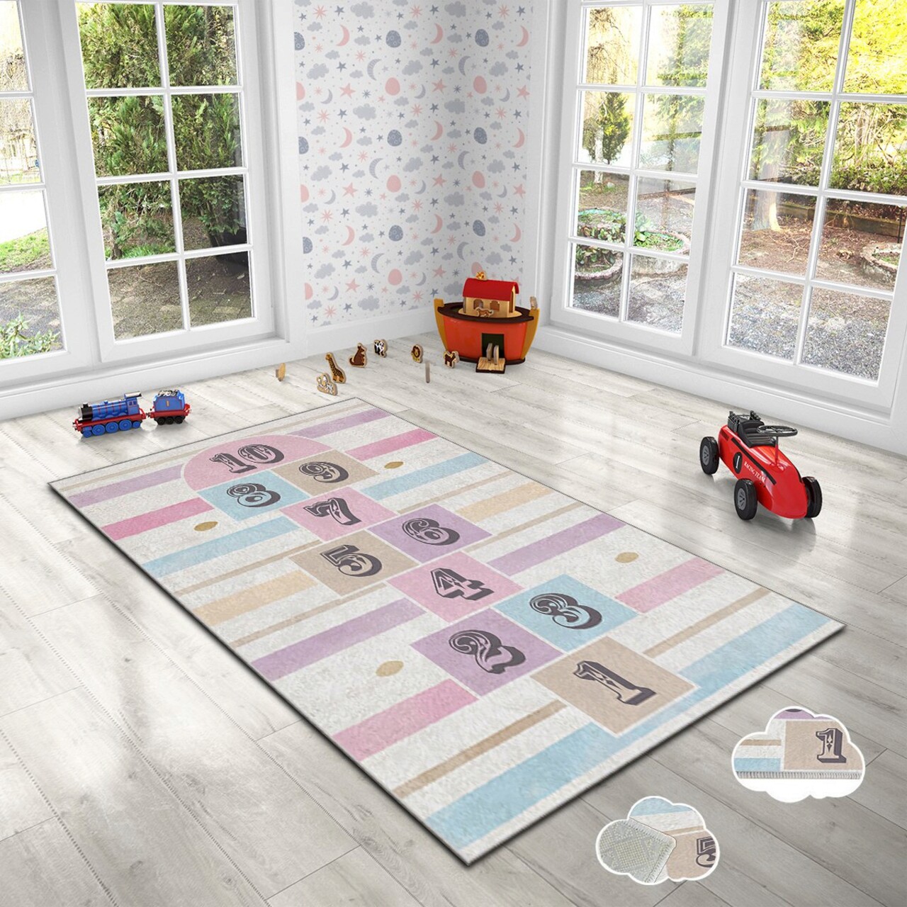 Covorul pentru copii Hmı Kdc-119, cu dimensiuni de 100 x 180 cm, aduce un strop de culoare în camera celor mici. Fabricat din catifea, acesta prezintă o imprimare vibrantă și plăcută, fiind perfect pentru a stimula imaginația copiilor. Partea inferioară este dotată cu un punct din pâslă anti-alunecare, asigurând astfel o utilizare în siguranță. Buretele laminat dintre materialele covorului facilitează curățarea, iar tratamentul antibacterian oferă un mediu mai sănătos. Cu o înălțime a firelor de 2 mm, acest covor este ideal pentru orice colțișor de joacă.