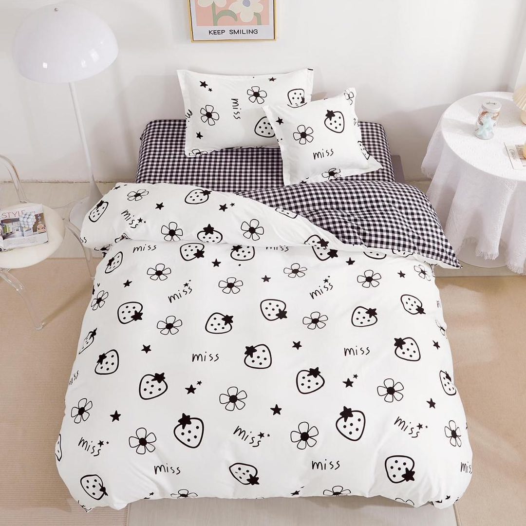 Lenjerie pat 1 PERSOANA BUMBAC FINET 4 piese cu ELASTIC Alb-Negru capsuni flori stelute