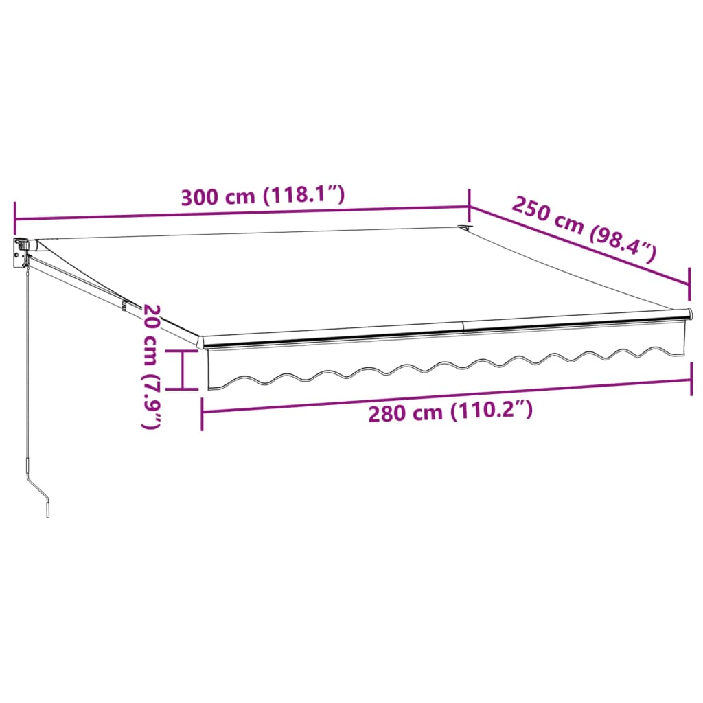 Creati un loc frumos si racoros pe terasa dvs. si protejati-va de razele UV cu aceasta copertina retractabila! Material durabil: Cadrul copertinei este fabricat din aluminiu vopsit electrostatic, care este robust si durabil. Tesatura cu tratament de suprafata PU este rezistenta la UV. Va va preveni familia sau oaspetii de razele UV si de lumina orbitoare a soarelui.Usor de operat: Unghiul si inaltimea pot fi ajustate pentru a satisface diferite nevoi. Puteti deschide si retrage copertina fara probleme cu ajutorul manivelei lungi de mana.Aplicatii largi: Aceasta copertina retractabila are un design simplu si elegant, care se va combina bine cu setarile dvs. de acasa ori cu cele comerciale. Este potrivita pentru o varietate de spatii, cum ar fi balcoane, terase, curti, restaurante, cafenele, magazine si multe altele.Culoarea material textil: MaroCuloare cadru: GriMaterial: Aluminiu vopsit electrostatic, material textil (100% poliester) cu acoperire PUDimensiuni totale: 300 x 250 cm (L x l)Rezistent la apa si murdarieAsamblare necesara: Da