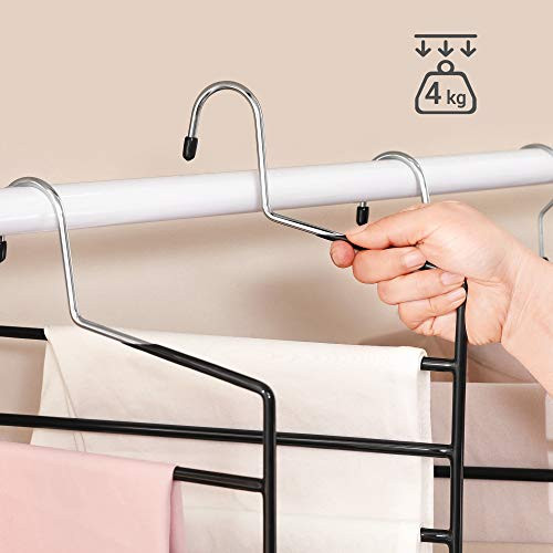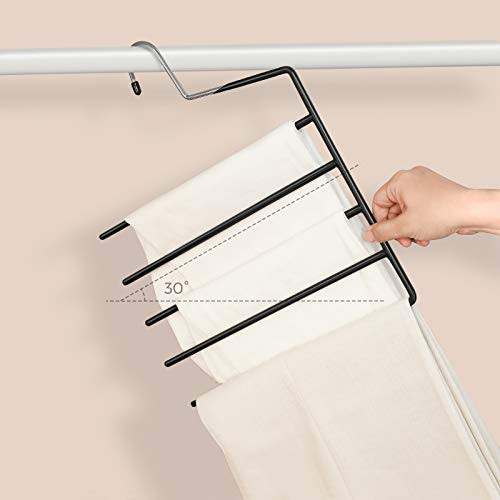 Setul de 4 umerașe cu 5 bare din metal Songmics, de dimensiuni 35x32x0.5 cm, este soluția ideală pentru a menține ordinea în dulapul tău. Cu ajutorul acestor umerașe ingenioase, poți economisi până la 80% din spațiu, păstrând pantalonii și accesoriile bine organizate. Nu mai risca să îți găsești hainele pe podea, datorită învelișului din PVC care previne alunecarea. Fabricate din metal rezistent, fiecare umeraș poate susține până la 4 kg, asigurând durabilitate și utilizare îndelungată. Organizează-ți garderoba eficient și cu stil!