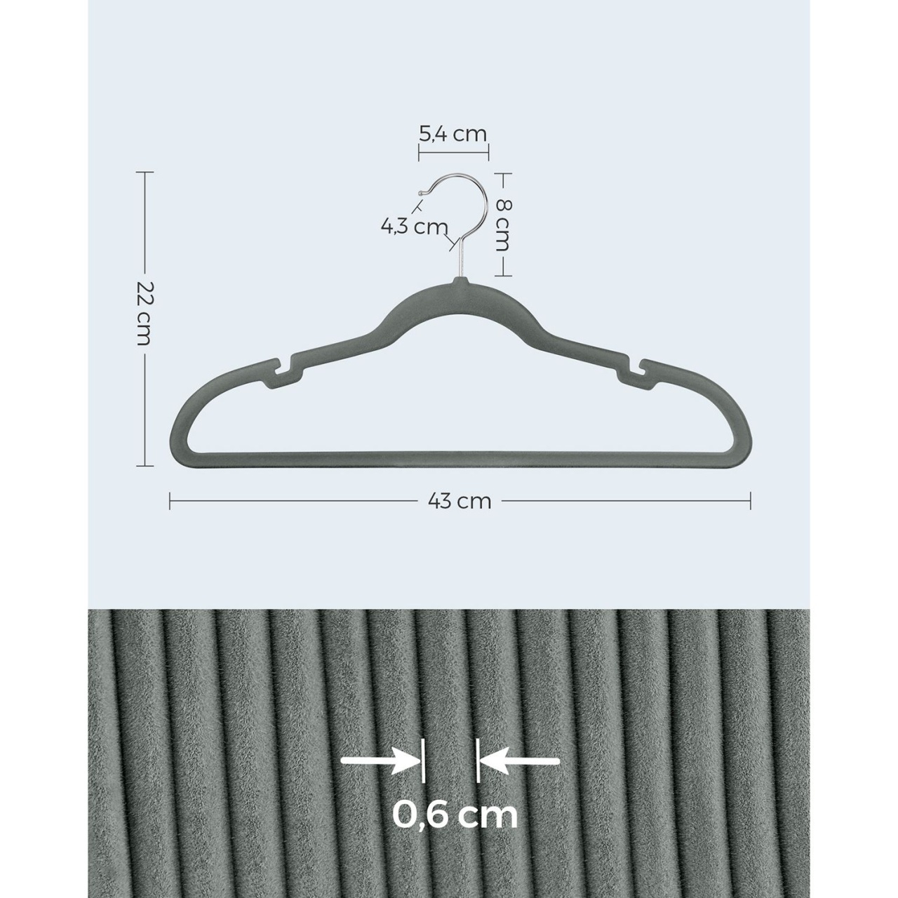 Setul de umerașe de catifea Songmics în nuanța gri, cu dimensiunile de 43x22x0,6 cm, este perfect pentru organizarea hainelor tale. Cu crestături inteligente pe umeri, acestea mențin în siguranță articolele cu bretele subțiri, prevenind alunecarea. Suprafața de catifea delicată protejează țesăturile sensibile și reduce șifonarea. Datorită grosimii de doar 0,6 cm, aceste umerase economisesc 30% din spațiul din dulap comparativ cu cele din lemn. Fiecare umeraș suportă până la 5 kg, iar cârligul pivotant la 360° facilitează accesibilitatea hainelor. Pachetul include 30 de umerase rezistente din plastic ABS.