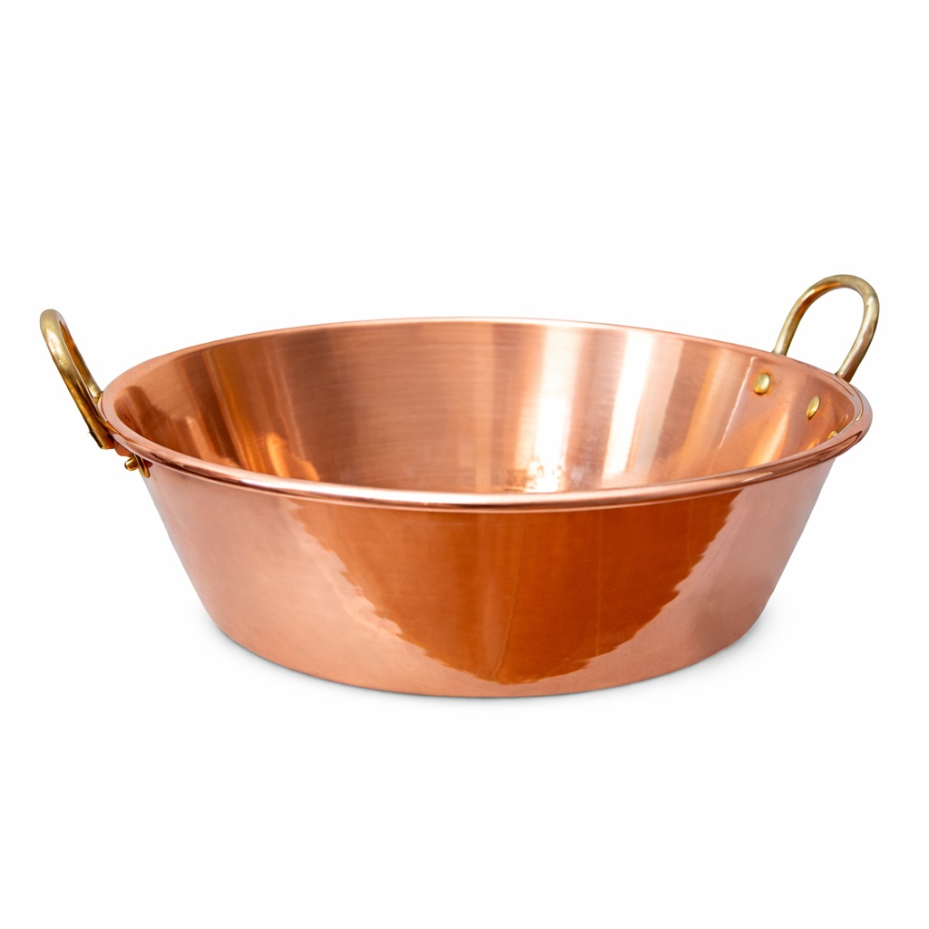Ceaunul din cupru masiv cu diametru de 38 cm este alegerea perfectă pentru pasionații de gătit. Datorită proprietăților sale excelente de distribuire a căldurii, acest vas este ideal pentru prepararea sosurilor de ciocolată, gemurilor și dulciurilor, precum și pentru mâncăruri tradiționale precum gulas sau tocanite. Fabricat din cupru de înaltă calitate, cu margini anti-picurare și mânere din bronz masiv, nituite, acesta asigură o manipulare ușoară. Este recomandat să nu depozitați mâncarea în el mai mult de 8-9 ore pentru a preveni oxidarea. Perfect pentru rețete delicioase!