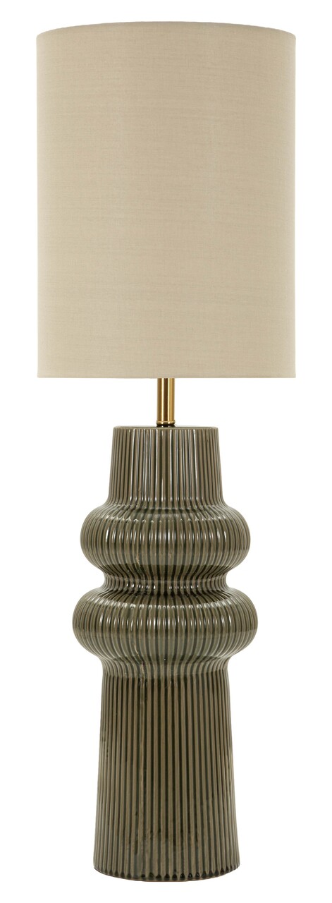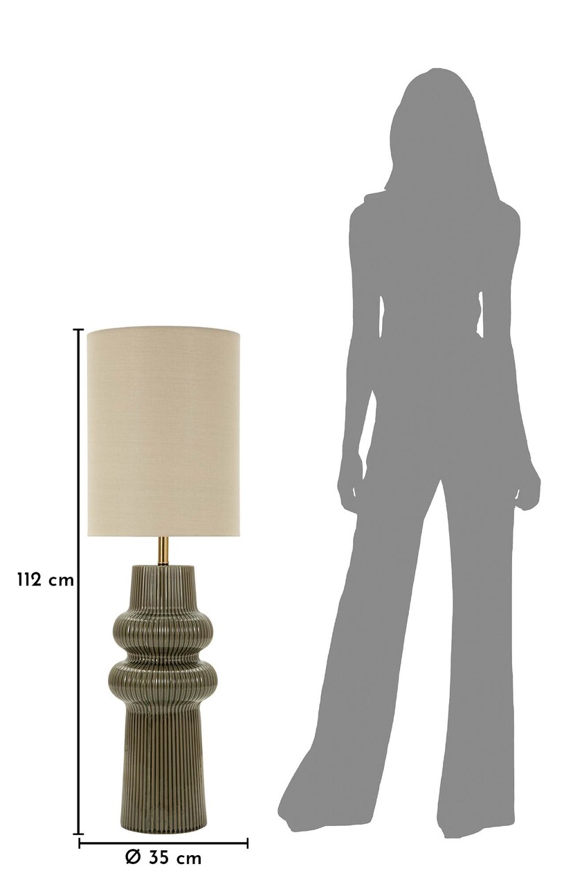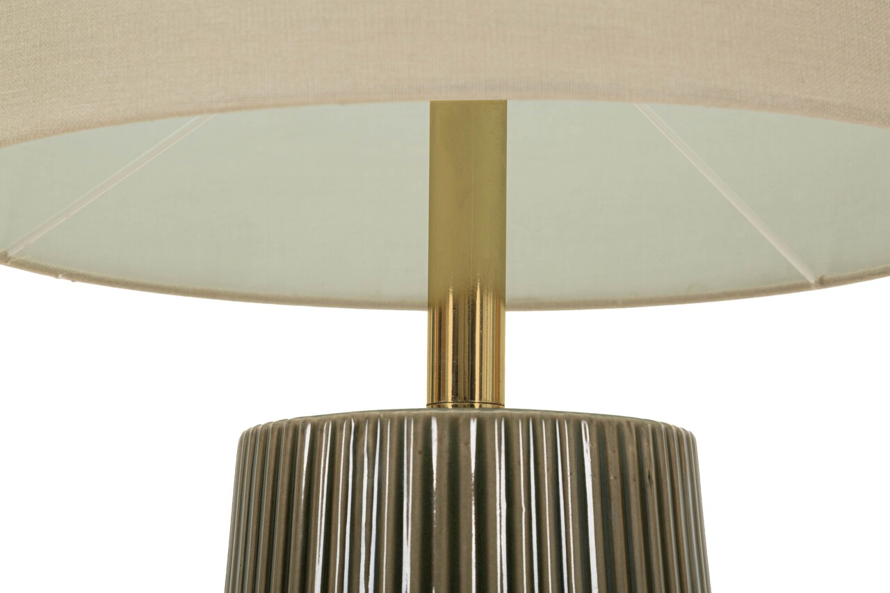 Lampadar din ceramica cu baza sculptata in nuanta gri-verde salvie si abajur din material textil bej. Forma echilibrata si efectul material ofera eleganta si sobrietate.Compozitie material: ceramica, fier, textil.Tip soclu: E27Numar becuri: 1Becul nu este inclus.Putere: 40WTensiune si frecventa: 220V, 50 Hz.