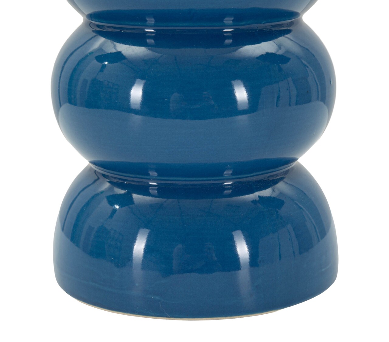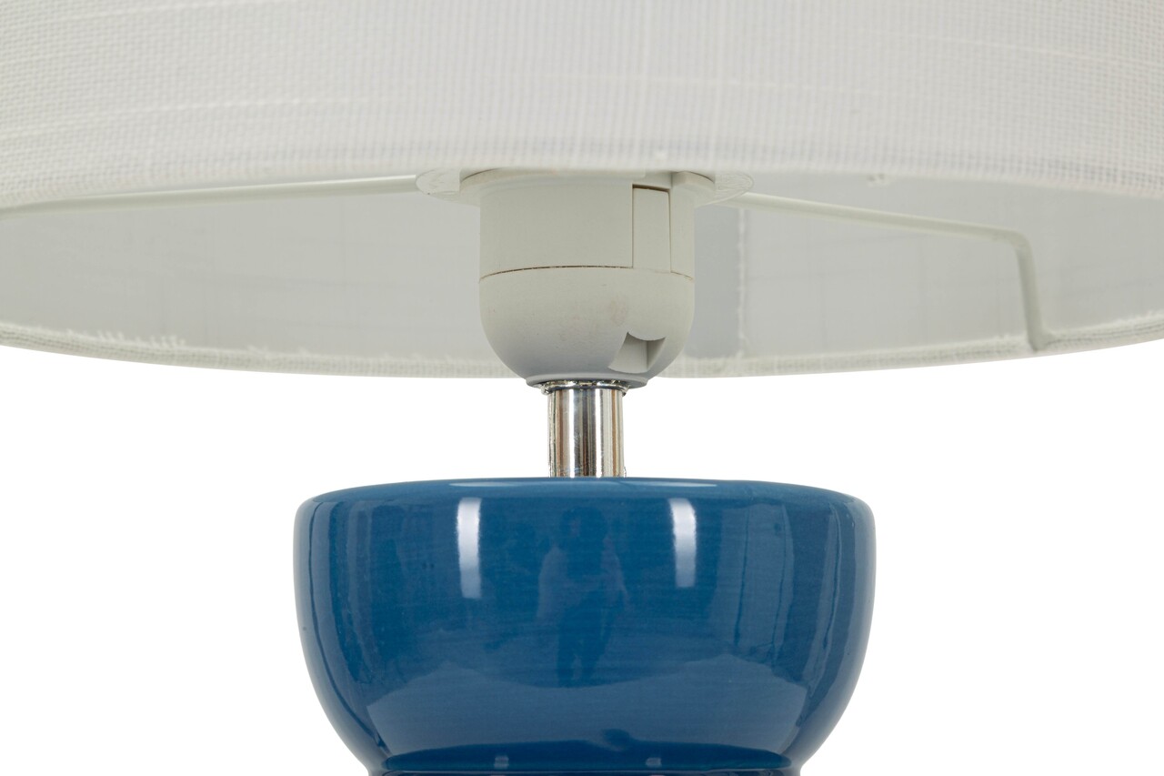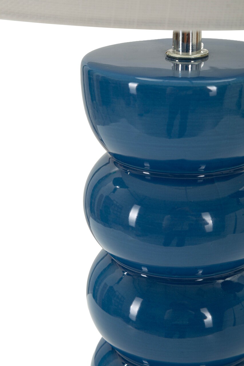 Lampa de masa din ceramica albastru intens lucios, cu baza formata din elemente rotunjite suprapuse. Abajurul alb creeaza un contrast modern si luminos.Compozitie material: ceramica, fier, textil.Tip soclu: E27Numar becuri: 1Becul nu este inclus.Putere: 40WTensiune si frecventa: 220V, 50 Hz.
