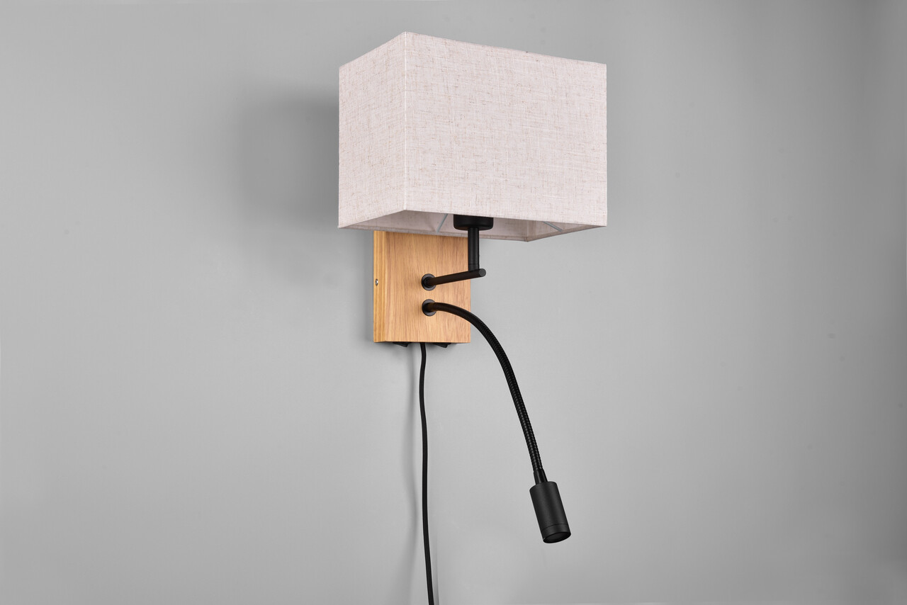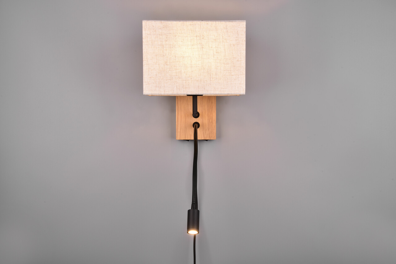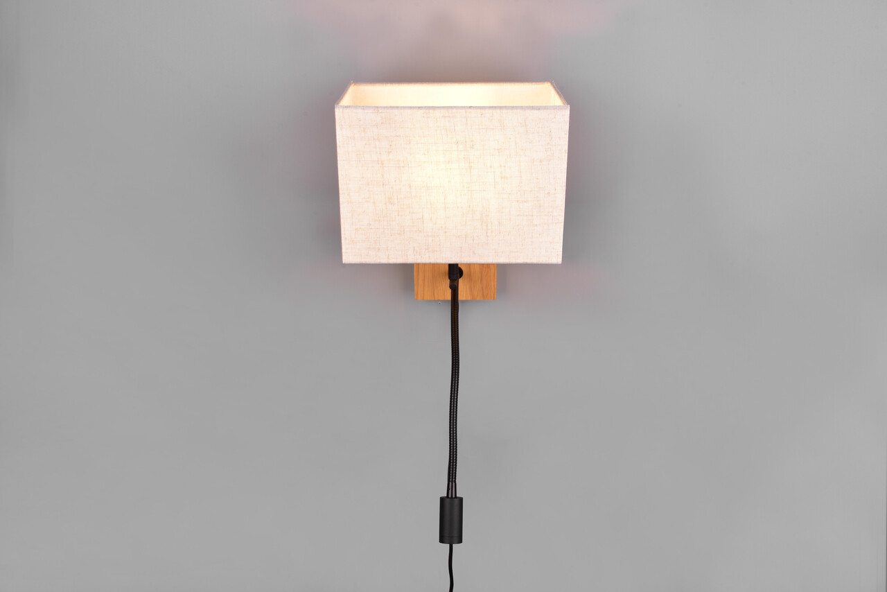 Lampa de perete Nilam de la TRIO, cu dimensiuni de 25x30 cm, aduce un strop de naturalețe și confort în dormitorul tău. Cu un abajur cubicat din material textil alb și detalii din lemn natural, această lampa oferă o lumină principală plăcută și un brat de citit flexibil, perfect pentru personalizarea iluminării. Ambele surse de lumină pot fi controlate separat, iar funcția FLEXconnect permite conectarea fixă sau prin cablu de priză. Recomandăm utilizarea unui bec LED pentru o iluminare modernă și eficientă, cu o durată de viață de 50.000 de ore și un flux luminos de 310 lumeni.